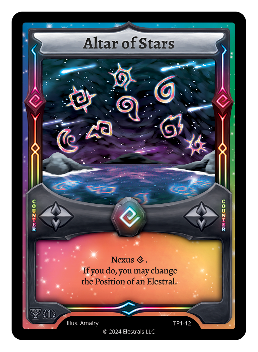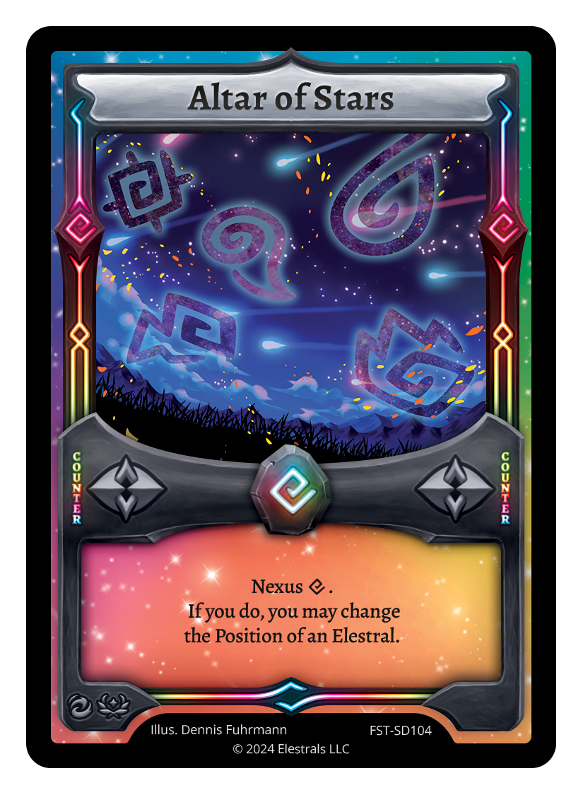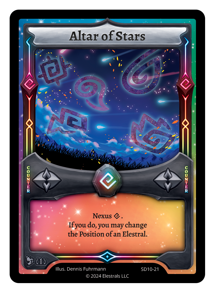 Altar of Stars❮❯❮❯❮❯❮❯❮❯❮❯❮❯❮❯SD08-21BS1-108BS1-108SD09-22TP1-12FST-SD104SD10-21LST-123TypeRuneCounterCostOmniElementsOmniCard TextNexus {X}. If you do, you may change the Position of an Elestral.