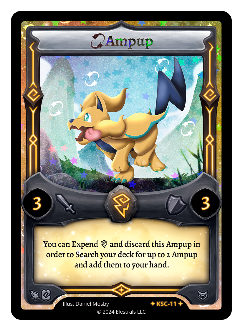 Ampup❮❯❮❯❮❯BS1-056BS1-056KSC-11TypeElestralCostThunderElementsThunderAttack3Defense3Card TextYou can Expend {T} and discard this Ampup in order to Search your deck for up to 2 Ampup and add them to your hand.SubclassesBrute