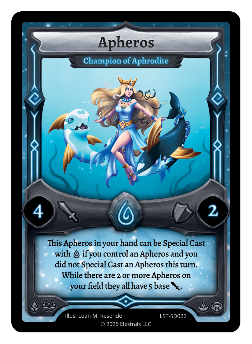 This Apheros can be Special Cast from your hand with {W} if you control an Apheros and you did not Special Cast an Apheros this turn. While there are 2 or more Apheros on your field they all have 5 base {J}.