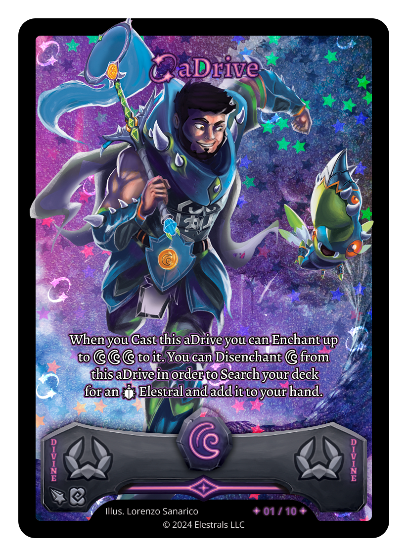 aDrive❮❯❮❯CP1-01XX/10TypeRuneDivineCostLunarElementsLunarCard TextWhen you Cast this aDrive you can Enchant up to {DDD} to it. You can Disenchant {D} from this aDrive in order to Search your deck for an {H} Elestral and add it to your hand.
