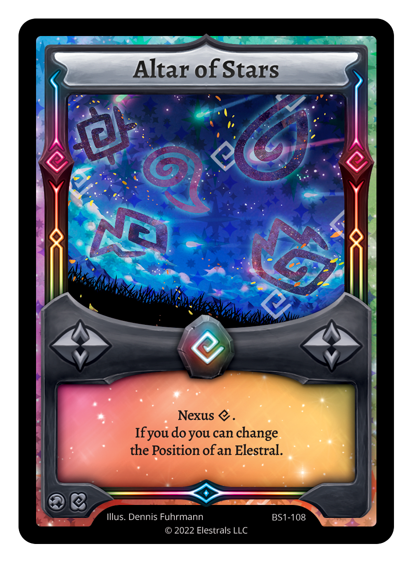 Altar of Stars❮❯❮❯❮❯❮❯❮❯❮❯❮❯❮❯SD08-21BS1-108BS1-108SD09-22TP1-12FST-SD104SD10-21LST-123TypeRuneCounterCostOmniElementsOmniCard TextNexus {X}. If you do, you may change the Position of an Elestral.