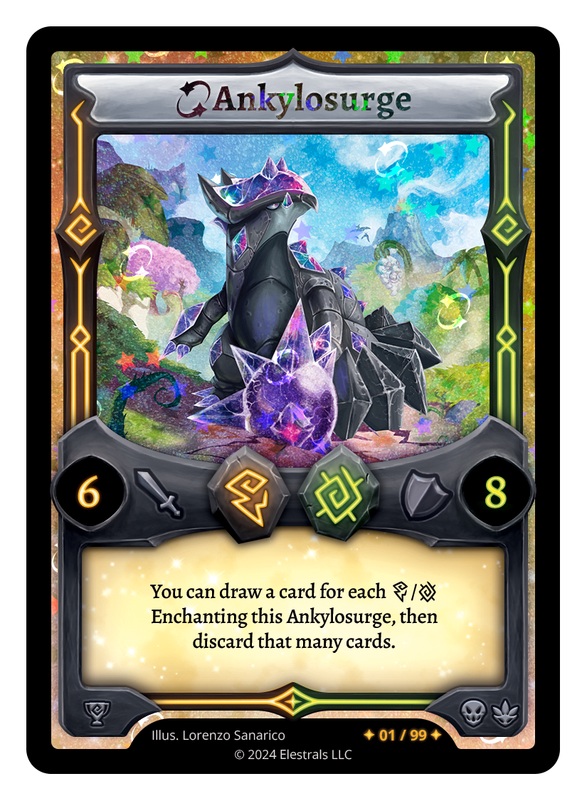 Ankylosurge❮❯❮❯❮❯❮❯❮❯FST-101FST-044XX/99SS3-007XX/10TypeElestralCostThunderEarthElementsThunderEarthAttack6Defense8Card TextYou can draw a card for each {T}/{E} Enchanting this Ankylosurge, then discard that many cards.SubclassesArchaicDryad