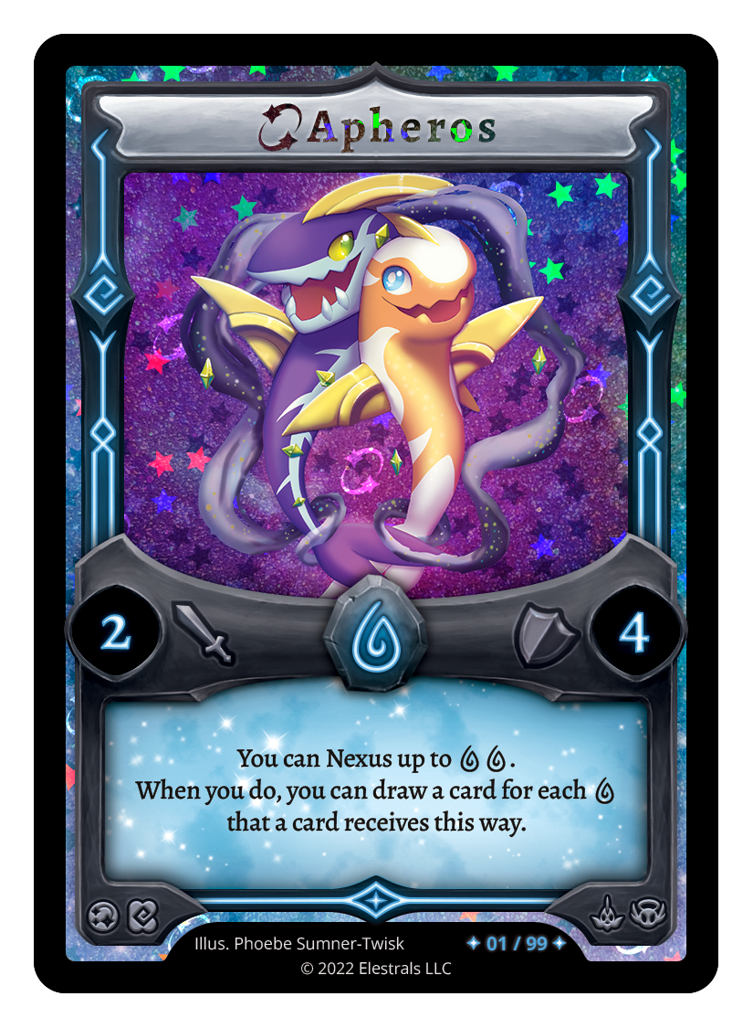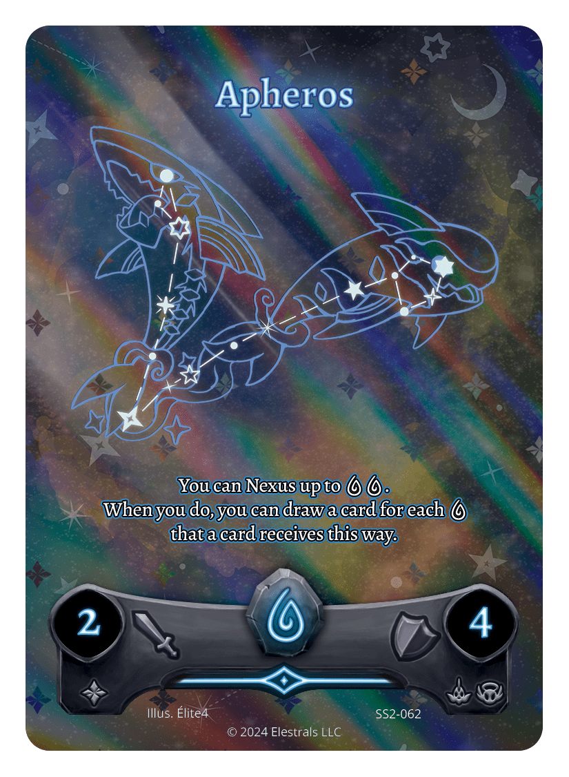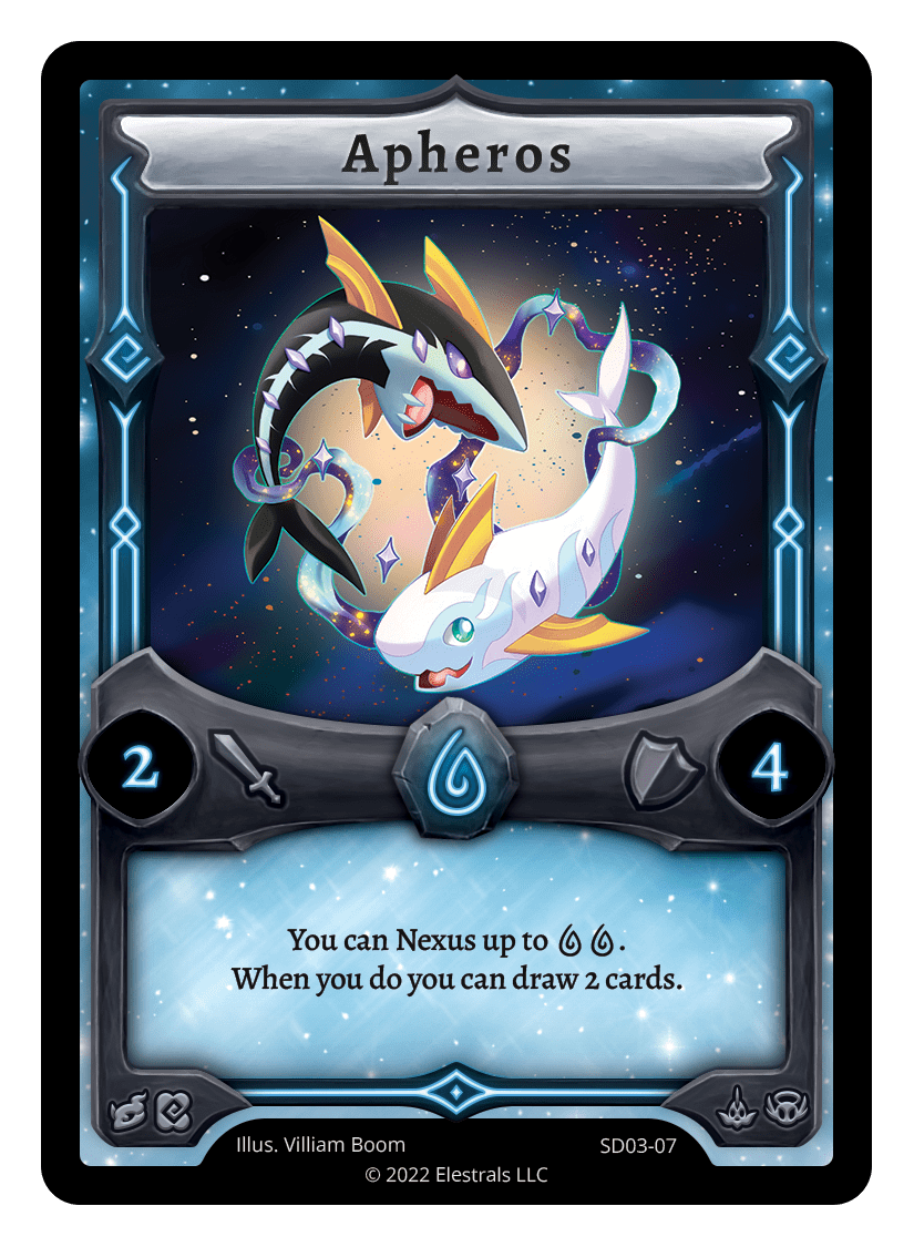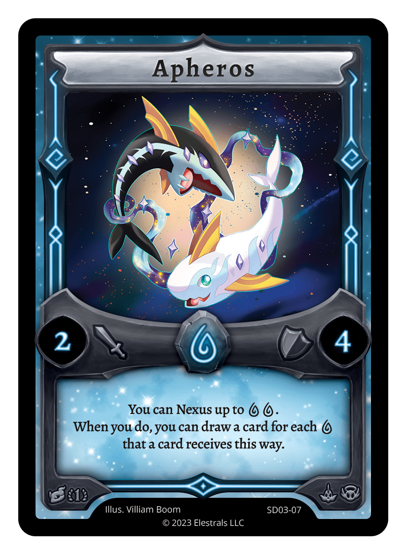 Apheros❮❯❮❯❮❯❮❯❮❯❮❯❮❯❮❯❮❯❮❯BS1-053XX/99BS1-053SD03-07SD03-07SD08-08EOP-R02SS2-056SS2-062LST-SD032TypeElestralCostWaterElementsWaterAttack2Defense4Card TextYou can Nexus up to {WW}. When you do, you can draw a card for each {W} that a card receives this way.SubclassesAquaticEthereal
