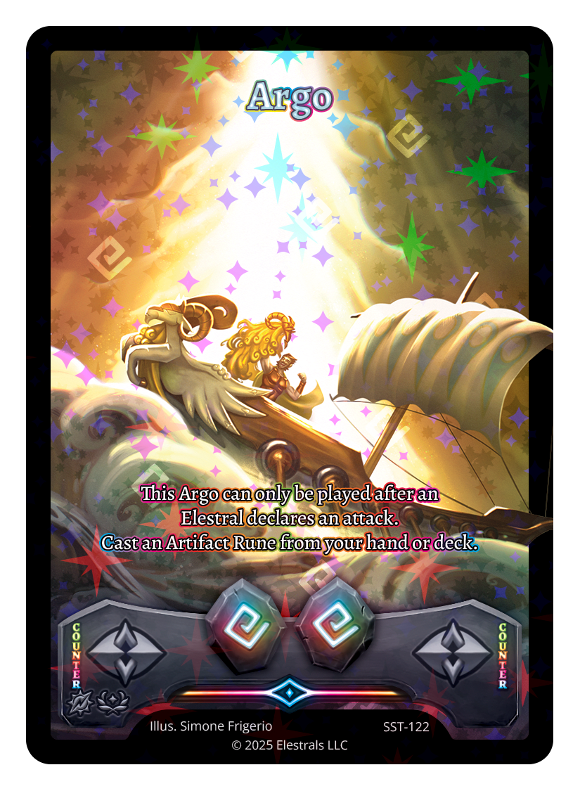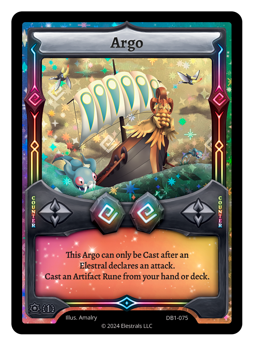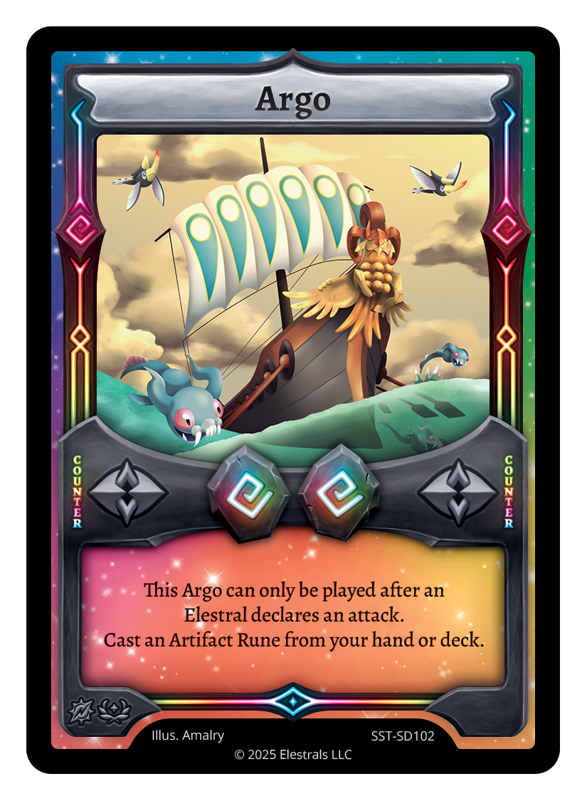 Argo❮❯❮❯❮❯❮❯❮❯❮❯❮❯DB1-075SD08-19SD09-19PR3-07TP2-12SST-122SST-SD102TypeRuneCounterCostOmniOmniElementsOmniCard TextThis Argo can only be played after an Elestral declares an attack. Cast an Artifact Rune from your hand or deck.