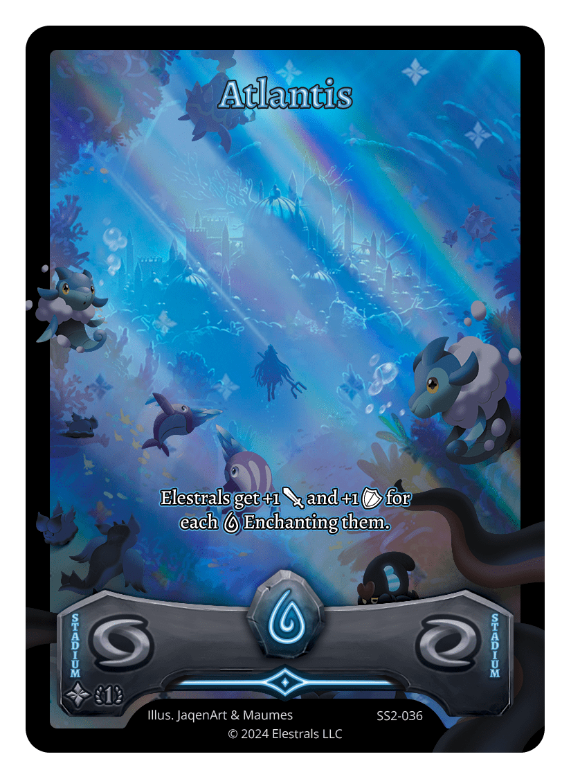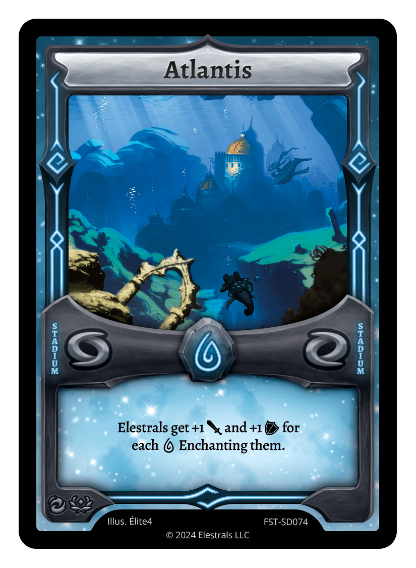 Atlantis❮❯❮❯❮❯❮❯❮❯❮❯❮❯❮❯❮❯SD03-17BS1-092BS1-092SD03-17SD08-17FF1-088SS2-036FST-SD074LST-SD070TypeRuneStadiumCostWaterElementsWaterCard TextElestrals get +1 {J} and +1 {O} for each {W} Enchanting them.