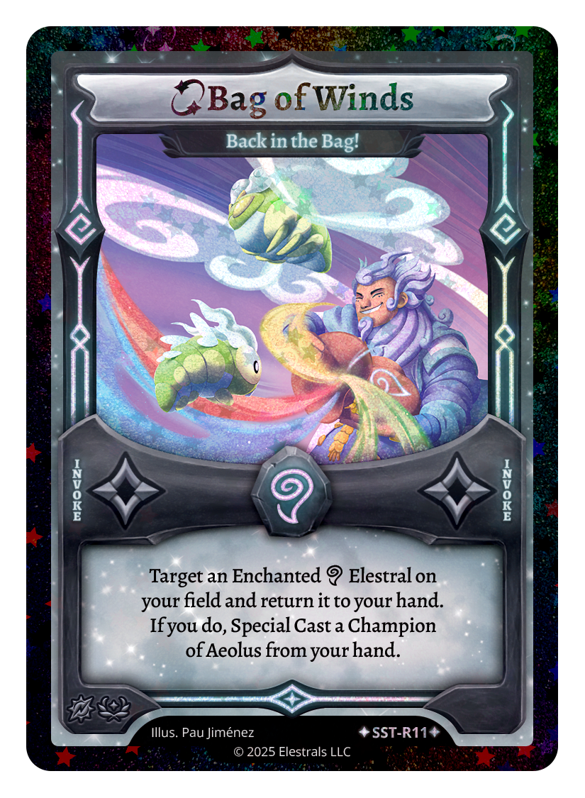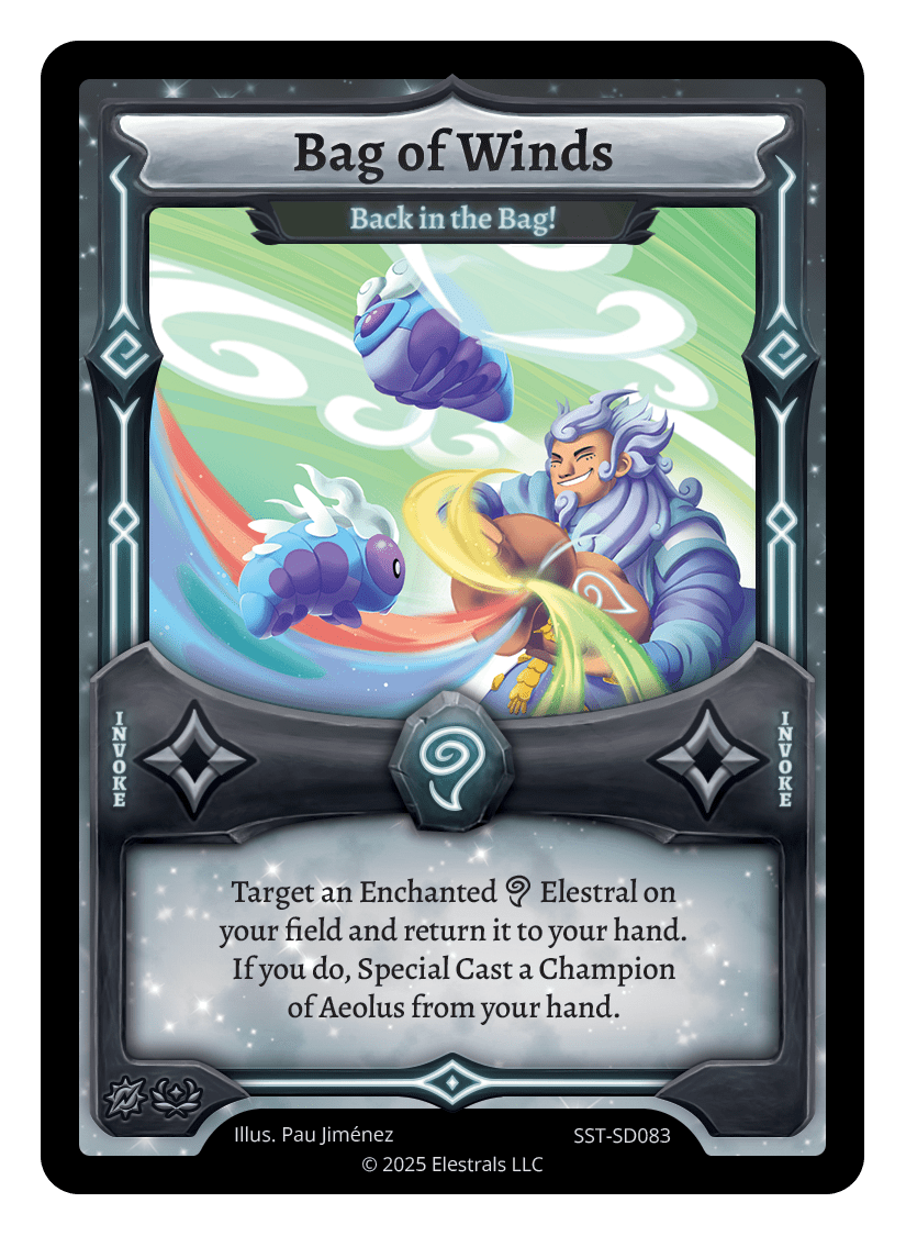 Bag of Winds - Back in the Bag!❮❯❮❯❮❯SST-095SST-R11SST-SD083TypeRuneInvokeCostWindElementsWindCard TextTarget an Enchanted {A} Elestral on your field and return it to your hand. If you do, Special Cast a Champion of Aeolus from your hand.