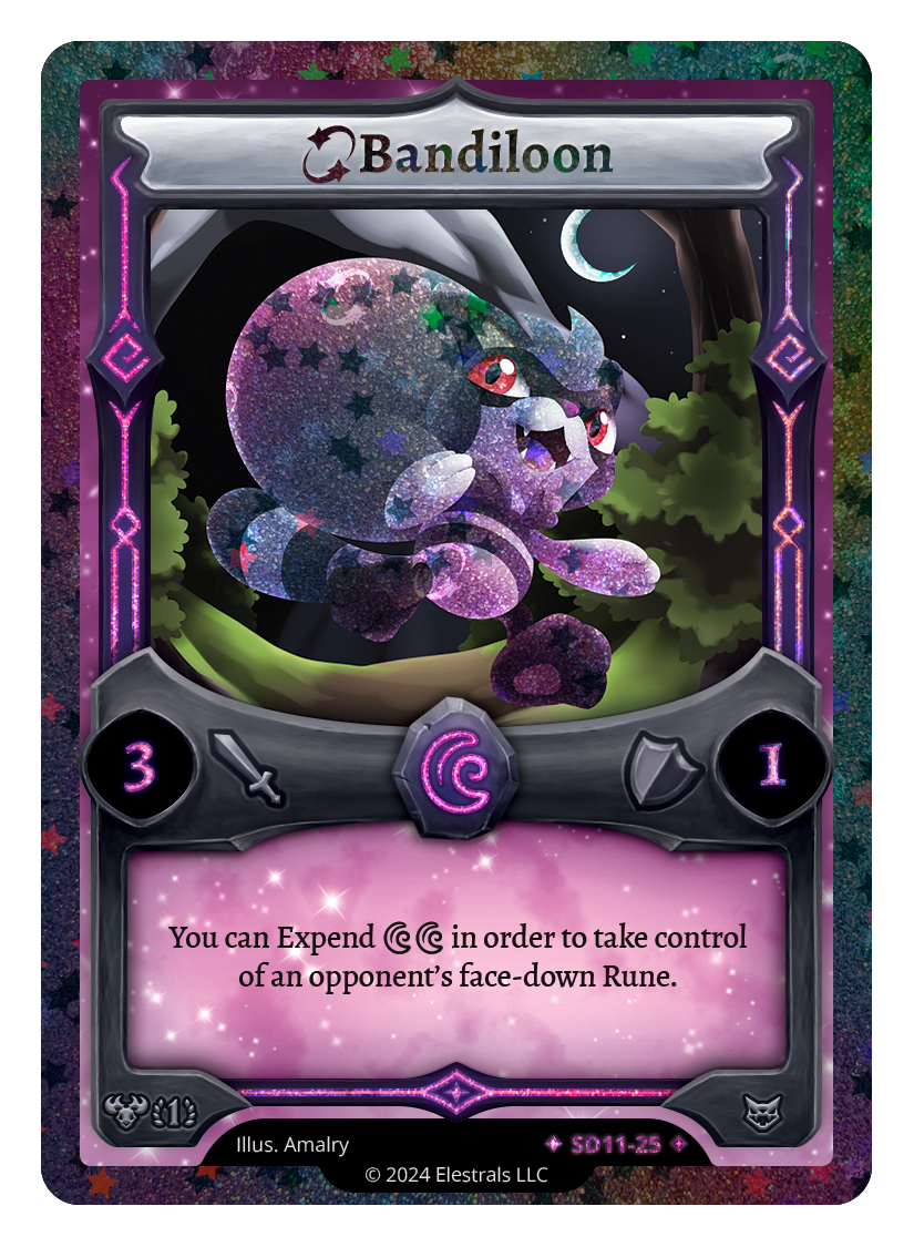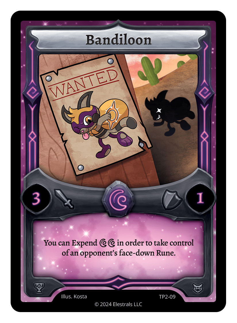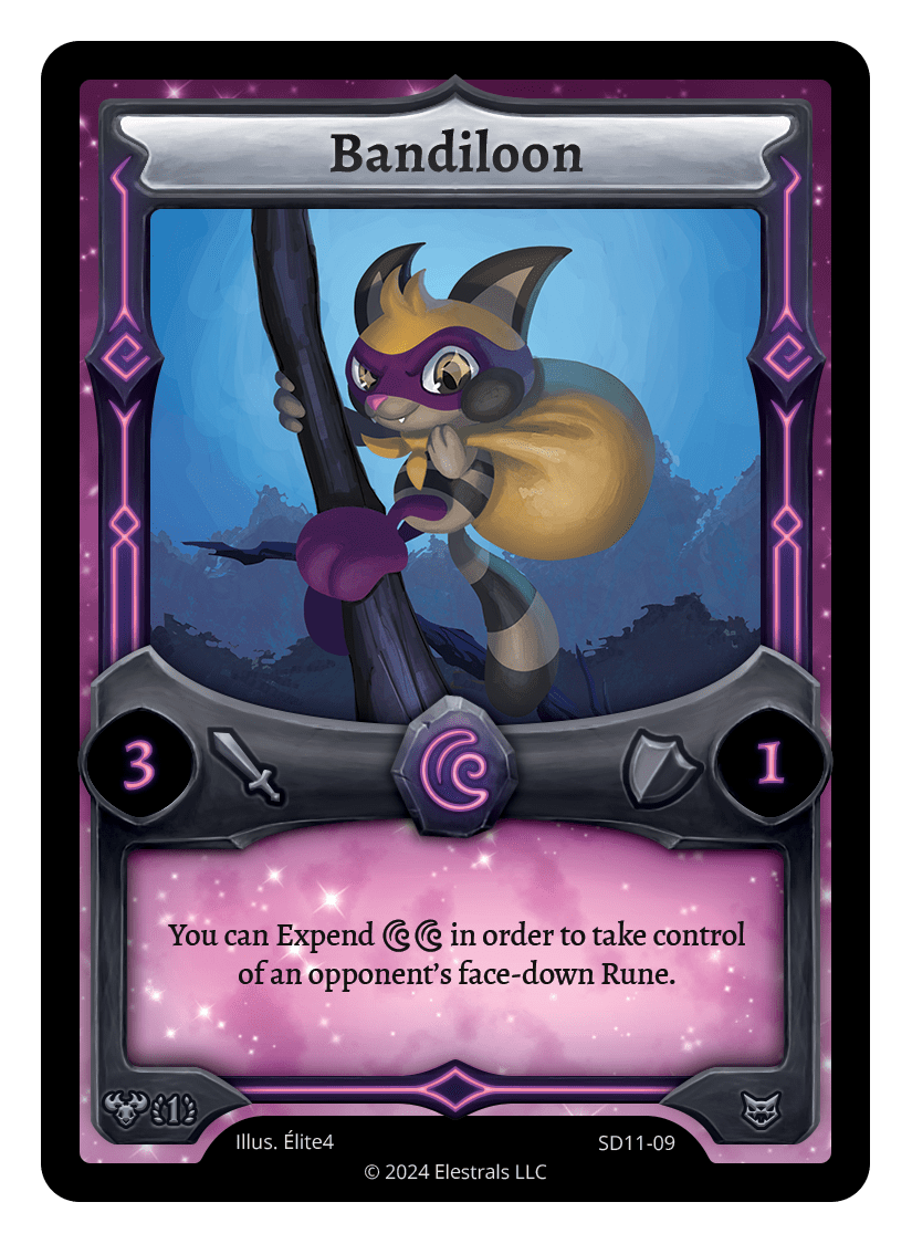Bandiloon❮❯❮❯❮❯❮❯MR1-031TP2-09SD11-09SD11-25TypeElestralCostLunarElementsLunarAttack3Defense1Card TextYou can Expend {DD} in order to take control of an opponent's face-down Rune.SubclassesBrute