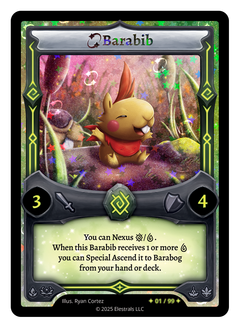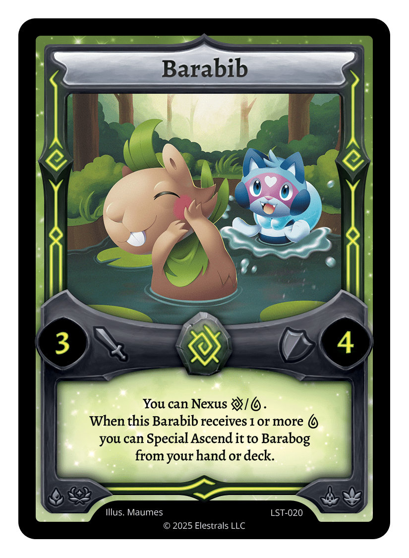Barabib (LST)❮❯❮❯XX/99LST-020TypeElestralCostEarthElementsEarthAttack3Defense4Card TextYou can Nexus {E}/{W}. When this Barabib receives 1 or more {W} you can Special Ascend it to Barabog from your hand or deck.SubclassesAquaticDryad