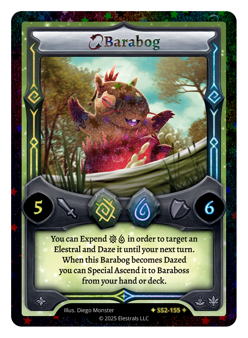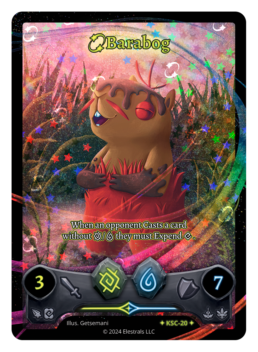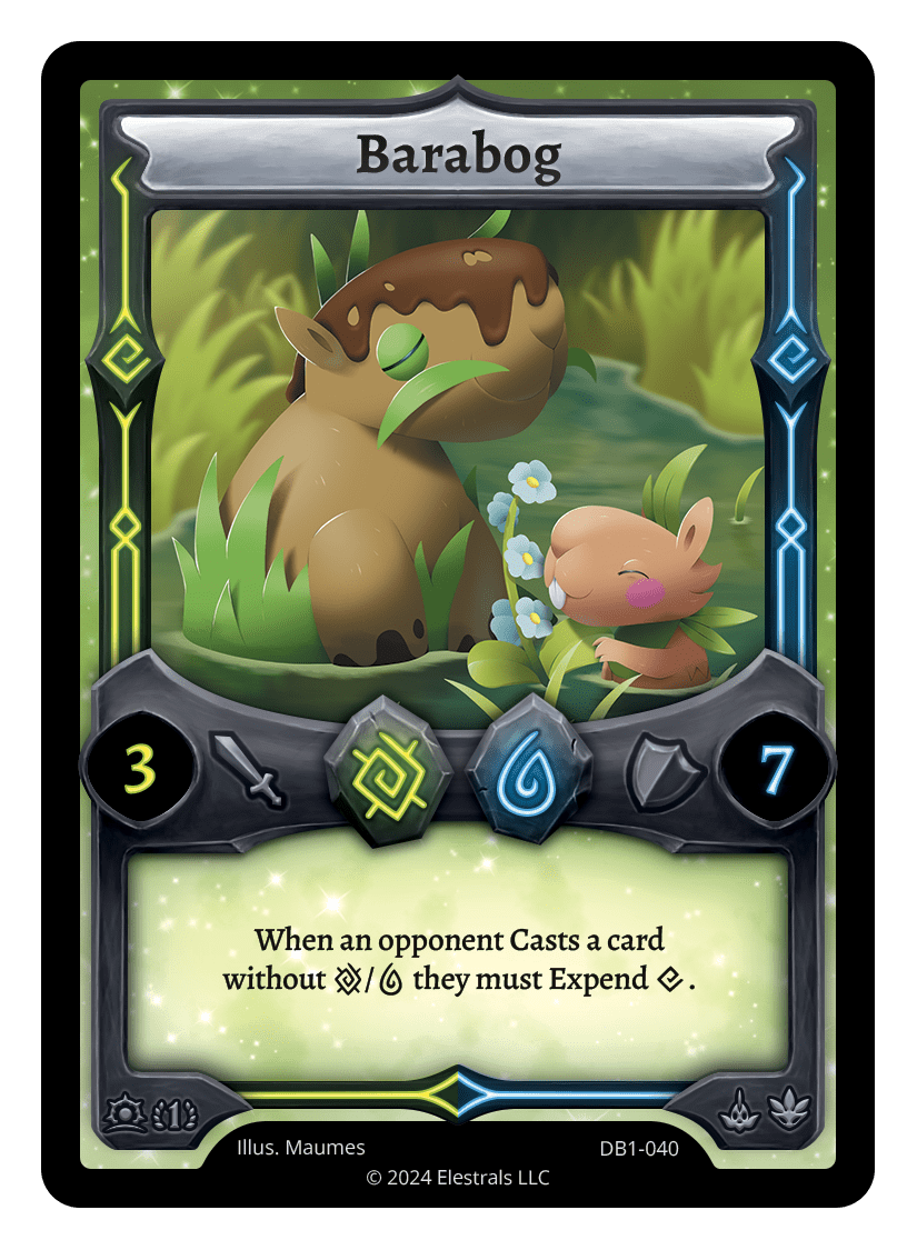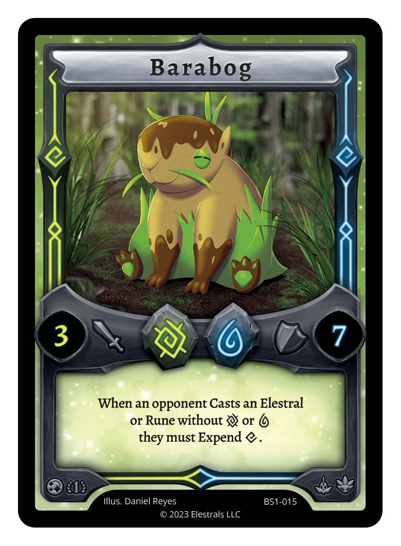Barabog❮❯❮❯❮❯❮❯❮❯BS1-015DB1-040BS1-015KSC-20SS2-155TypeElestralCostEarthWaterElementsEarthWaterAttack3Defense7Card TextWhen an opponent Casts a card without {E}/{W} they must Expend {X}.SubclassesAquaticDryad