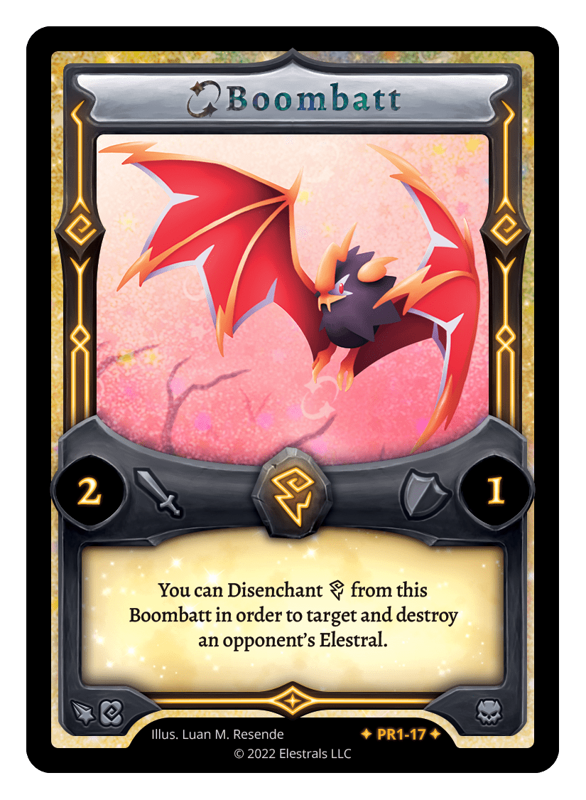 Boombatt❮❯❮❯❮❯❮❯❮❯❮❯❮❯❮❯❮❯❮❯❮❯❮❯SD07-09BS1-054SD04-10SD01-12BS1-054PR1-17SD05-10SD04-10SD05-10SD01-12SS2-183SST-SD031TypeElestralCostThunderElementsThunderAttack2Defense1Card TextYou can Disenchant {T} from this Boombatt in order to target and destroy an opponent's Elestral.SubclassesEldritch