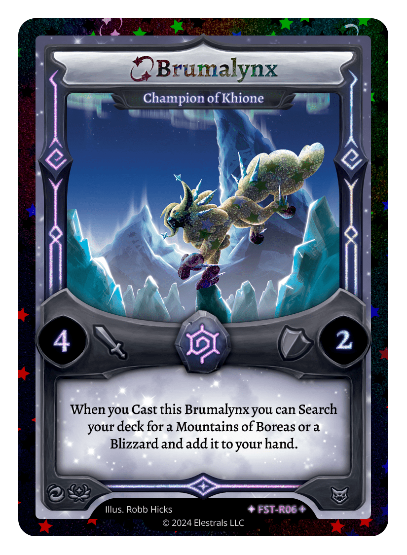 Brumalynx - Champion of Khione❮❯❮❯❮❯❮❯FST-059FST-R06EOP-006LST-SD042TypeElestralCostFrostElementsFrostAttack4Defense2Card TextWhen you Cast this Brumalynx you can Search your deck for a Mountains of Boreas or a Blizzard and add it to your hand.SubclassesBrute