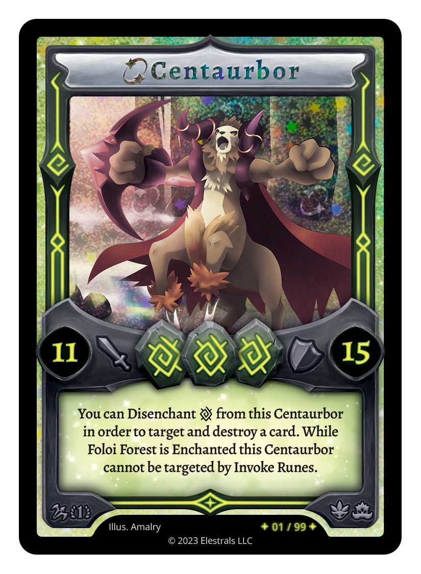 You can Disenchant {E} from this Centaurbor in order to target and destroy a card. While Foloi Forest is Enchanted this Centaurbor cannot be targeted by Invoke Runes.