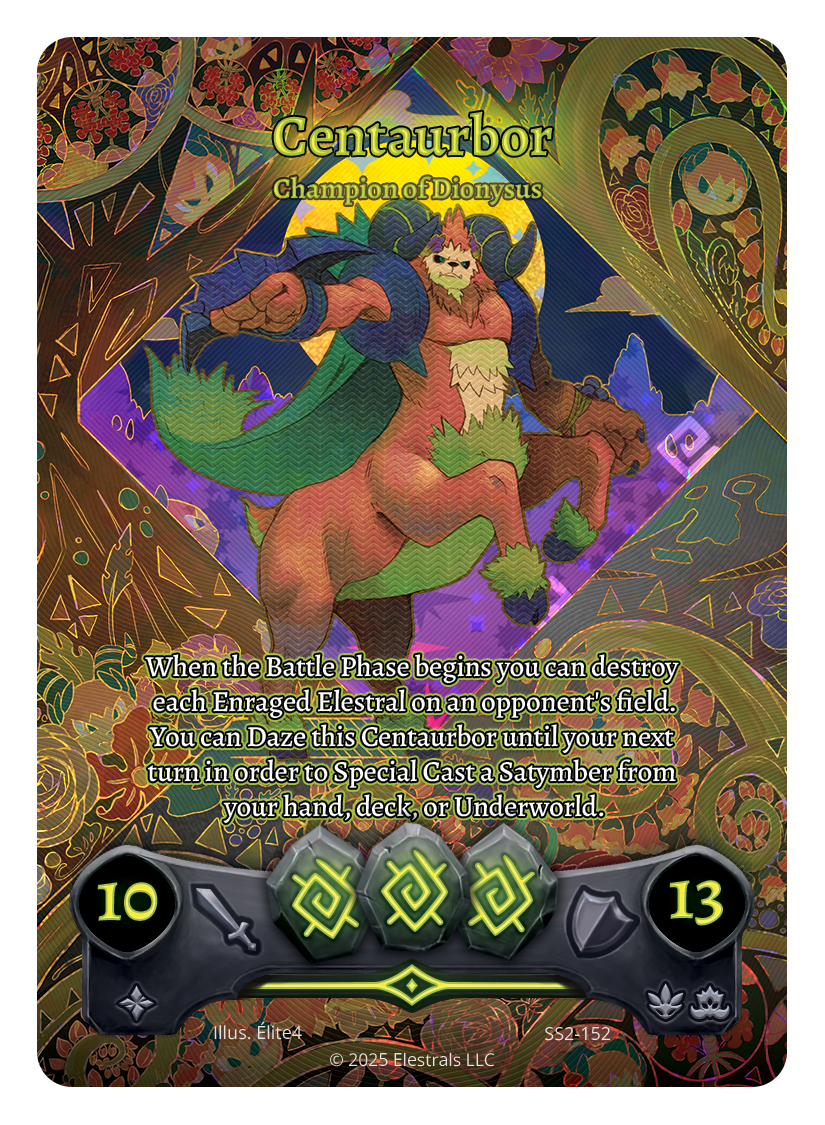 When the Battle Phase begins you can destroy each Enraged Elestral on an opponent's field. You can Daze this Centaurbor until your next turn in order to Special Cast a Satymber from your hand, deck, or Underworld.