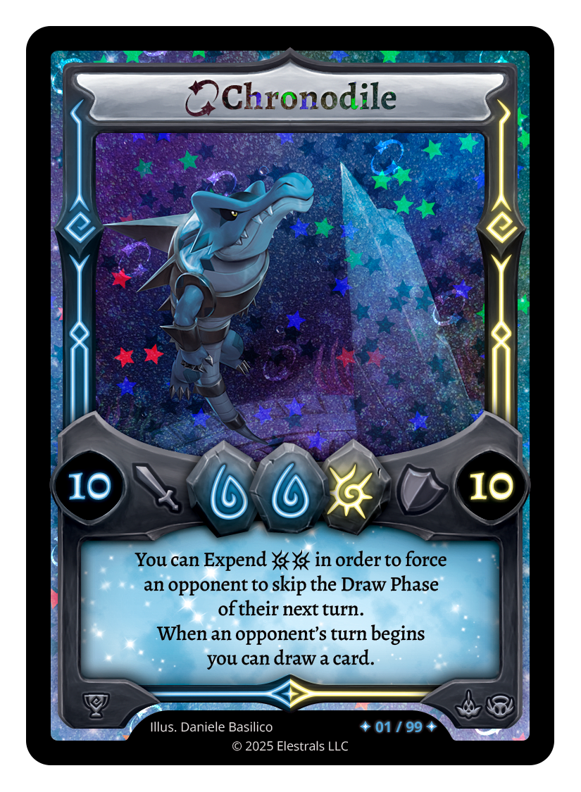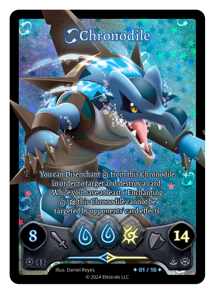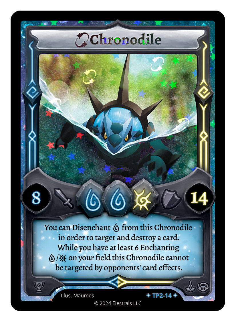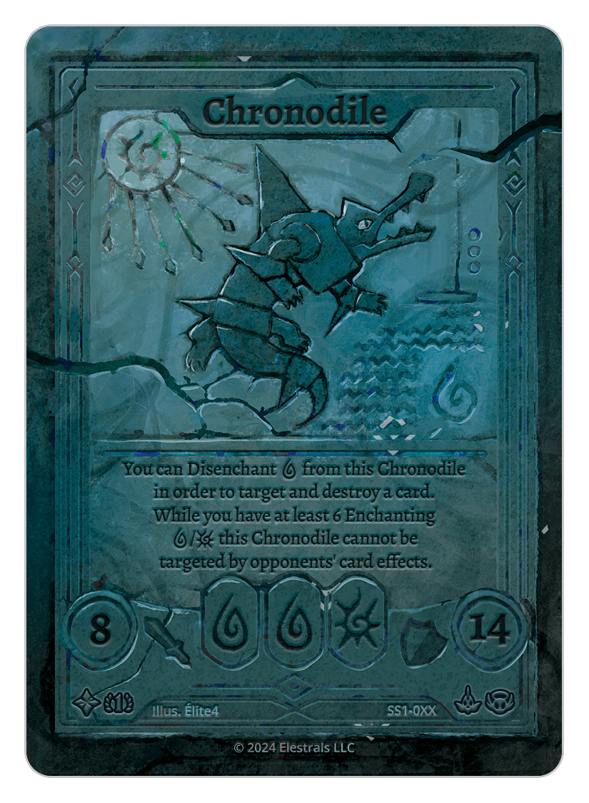 You can Disenchant {W} from this Chronodile in order to target and destroy a card. While you have at least 6 Enchanting {W}/{L} on your field this Chronodile cannot be targeted by opponents' card effects.