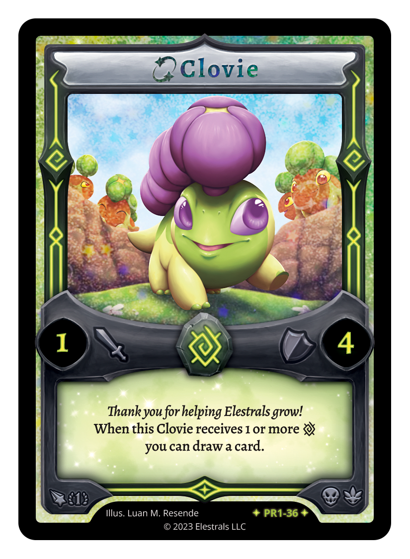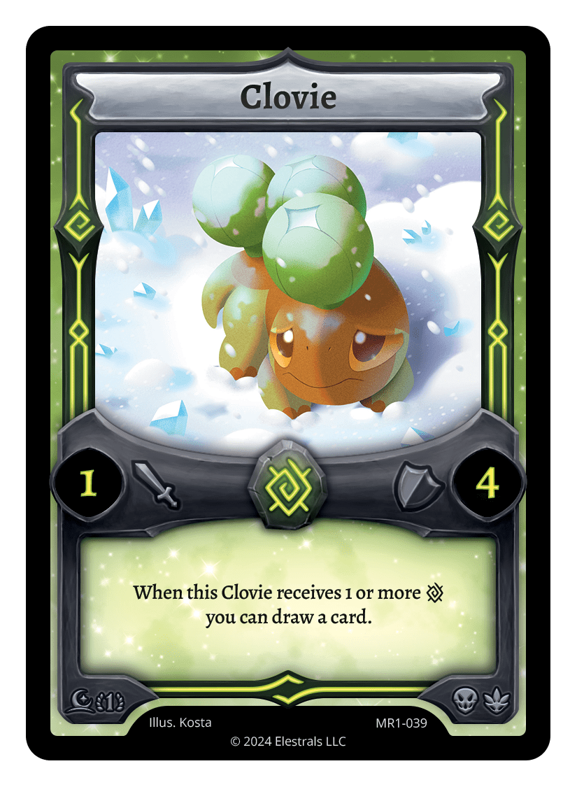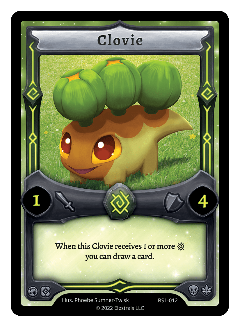 Clovie❮❯❮❯❮❯❮❯BS1-012PR1-36BS1-012MR1-039TypeElestralCostEarthElementsEarthAttack1Defense4Card TextWhen this Clovie receives 1 or more {E} you can draw a card.SubclassesArchaicDryad