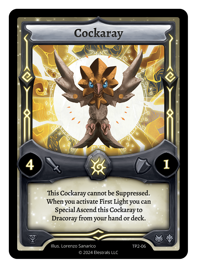 Cockaray❮❯❮❯MR1-067TP2-06TypeElestralCostSolarElementsSolarAttack4Defense1Card TextThis Cockaray cannot be Suppressed. When you activate First Light you can Special Ascend this Cockaray to Dracoray from your hand or deck.SubclassesAvianDragon
