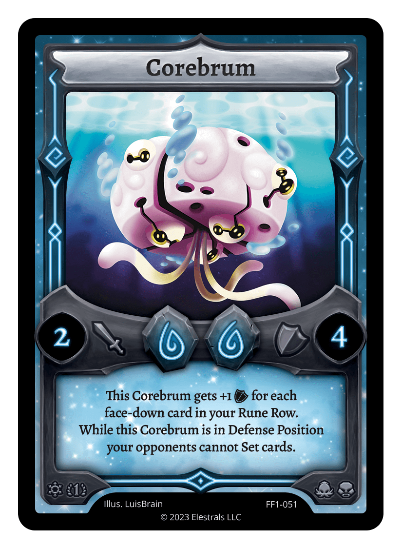 This Corebrum gets +1 {O} for each face-down card in your Rune Row. While this Corebrum is in Defense Position your opponents cannot Set cards.