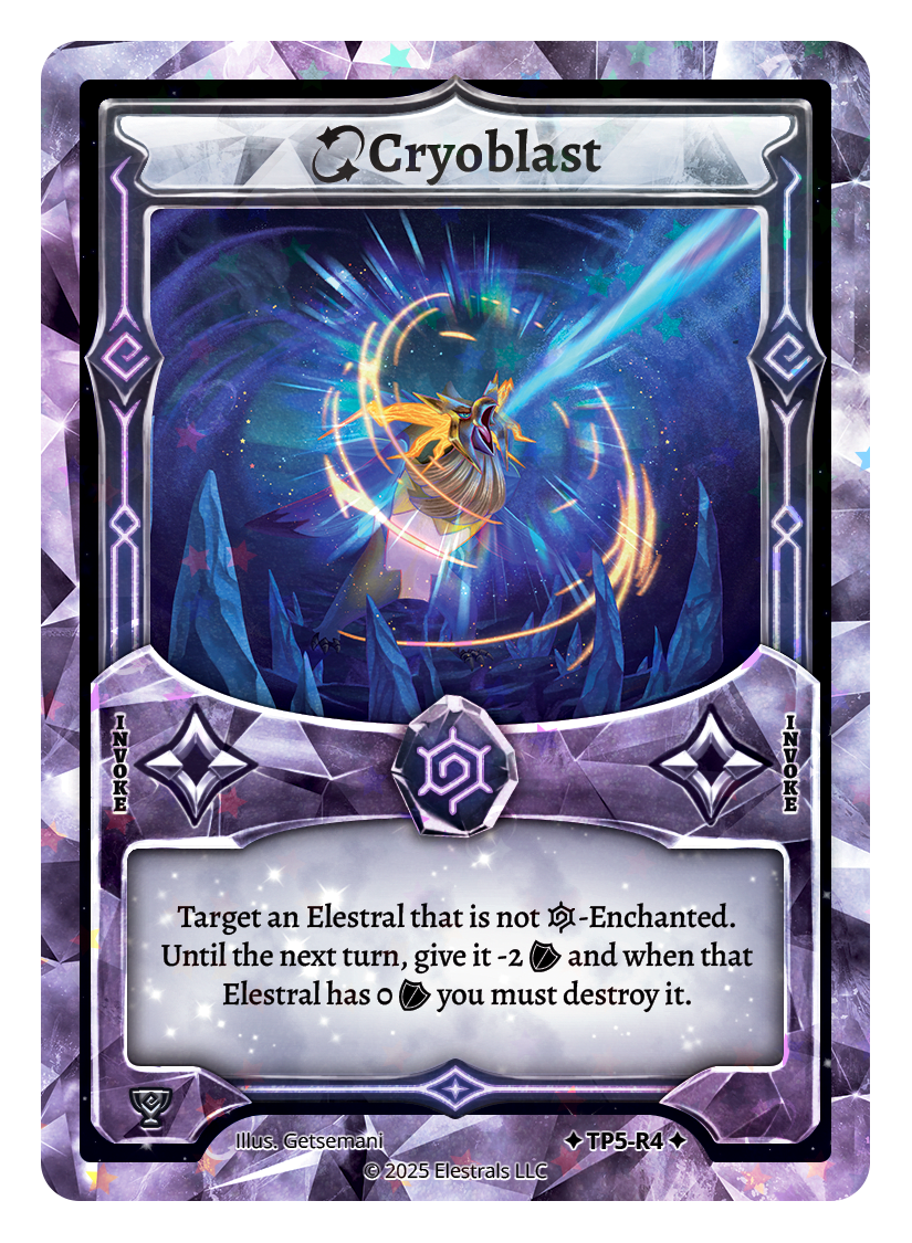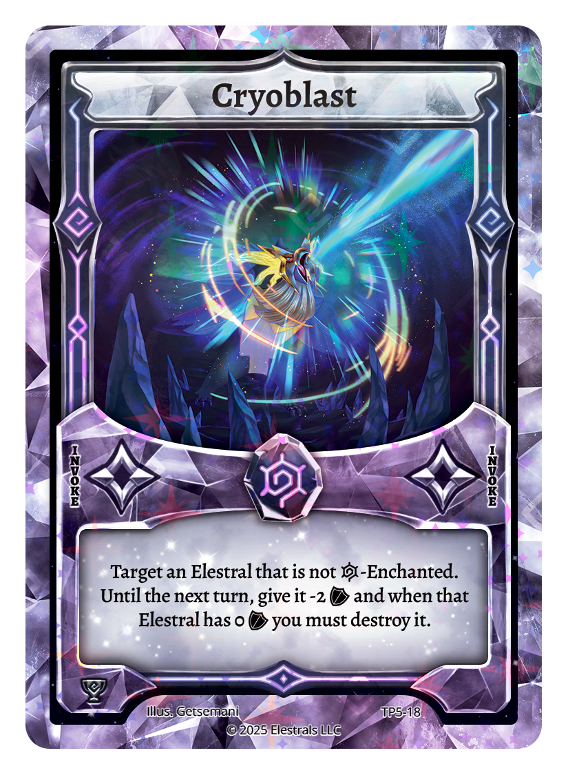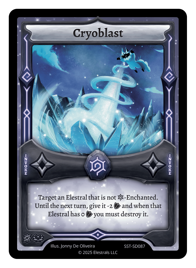 Cryoblast❮❯❮❯❮❯❮❯❮❯❮❯❮❯DB1-078TP2-11FST-SD093LST-SD081SST-SD087TP5-18TP5-R4TypeRuneInvokeCostFrostElementsFrostCard TextTarget an Elestral that is not {I}-Enchanted. Until the next turn, give it -2 {O} and when that Elestral has 0 {O} you must destroy it.