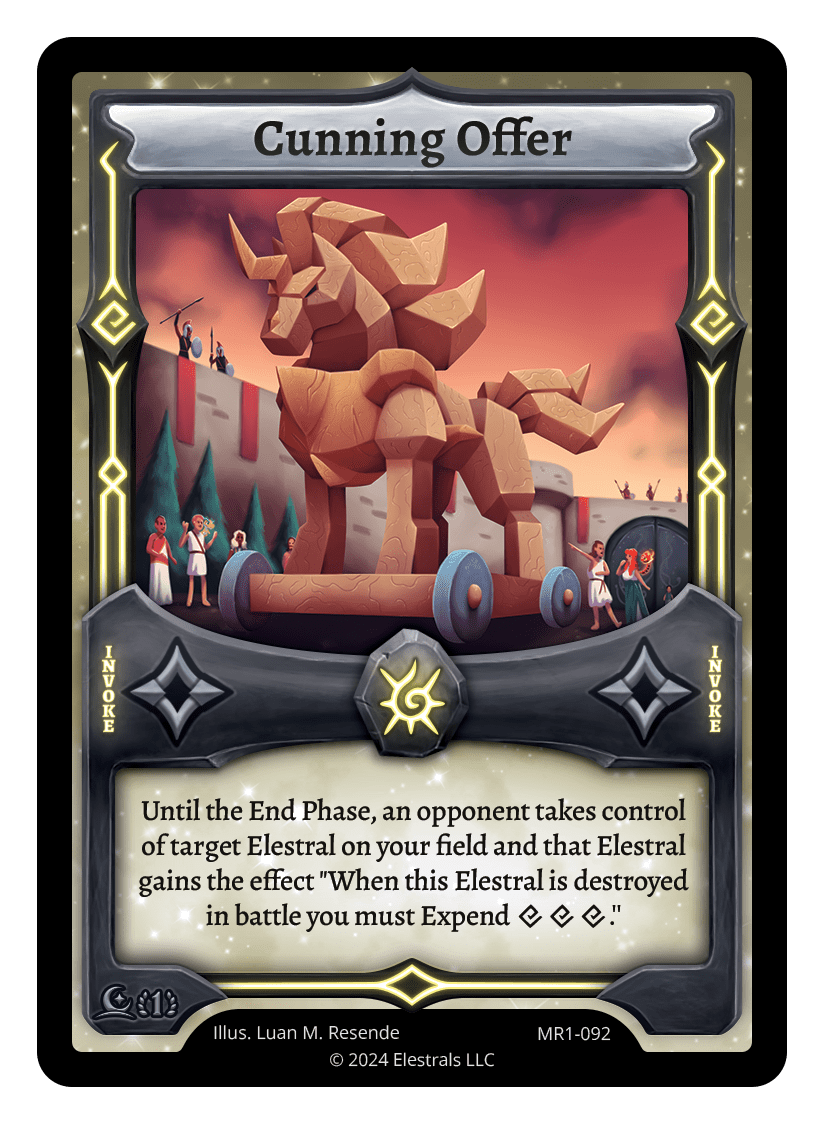 Cunning Offer❮❯MR1-092TypeRuneInvokeCostSolarElementsSolarCard TextUntil the next turn, an opponent takes control of target Elestral on your field and that Elestral gains the effect "When this Elestral is destroyed in battle you must Expend {XXX}."