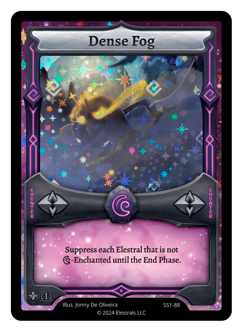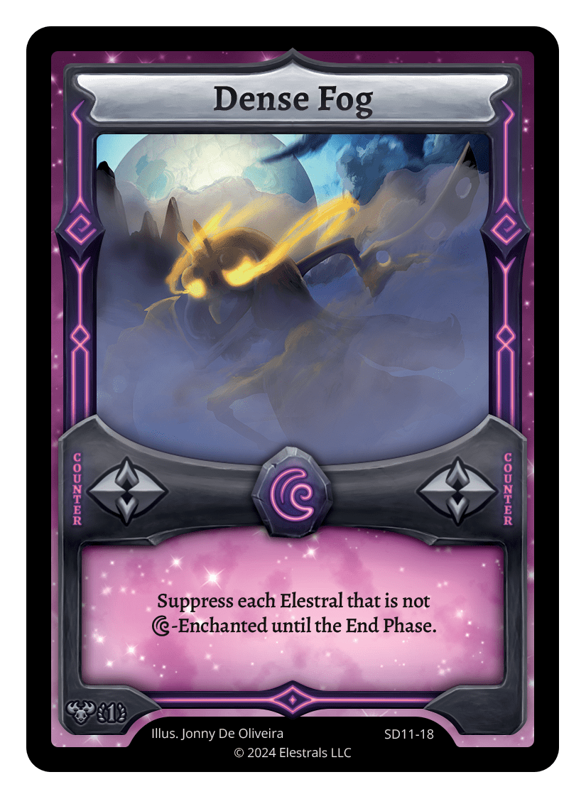 Dense Fog❮❯❮❯❮❯❮❯❮❯❮❯SD09-23DB1-072SS1-88FST-SD095SD11-18LST-SD092TypeRuneCounterCostLunarElementsLunarCard TextSuppress each Elestral that is not {D}-Enchanted until the next turn.