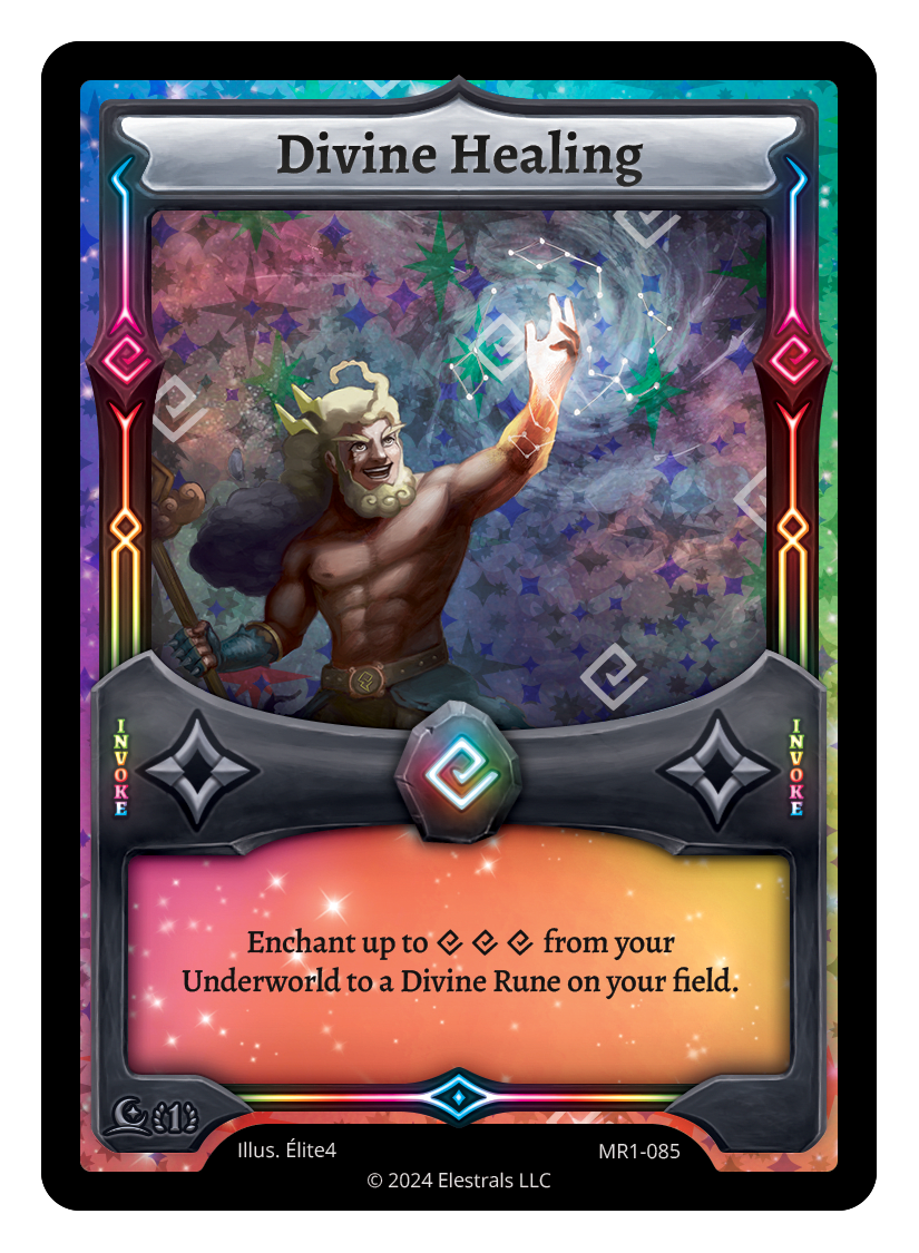 Divine Healing❮❯❮❯❮❯❮❯MR1-085FST-SD099SD10-24SD11-22TypeRuneInvokeCostOmniElementsOmniCard TextEnchant up to {XXX} from your Underworld to a Divine Rune on your field.