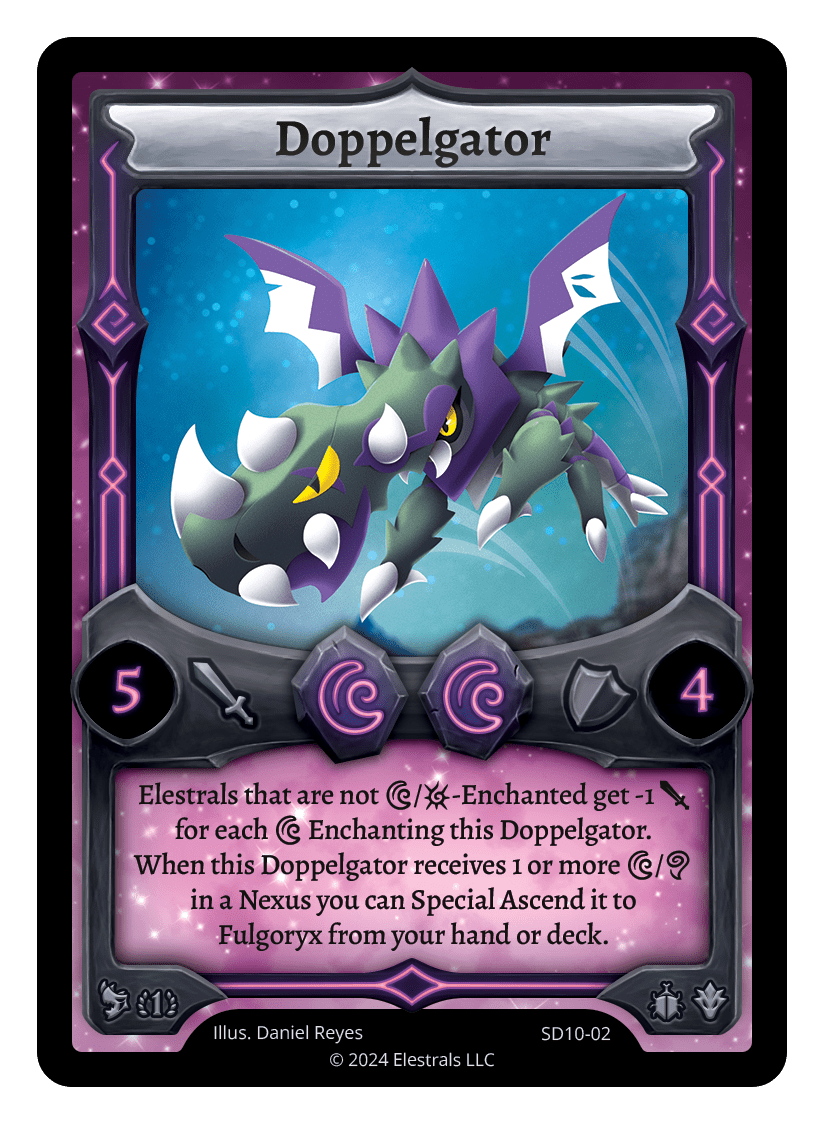 Elestrals that are not {D}/{L}-Enchanted get -1 {J} for each {D} Enchanting this Doppelgator. When this Doppelgator receives 1 or more {D}/{A} in a Nexus you can Special Ascend it to Fulgoryx from your hand or deck.