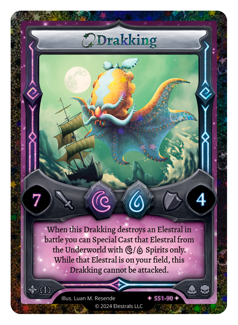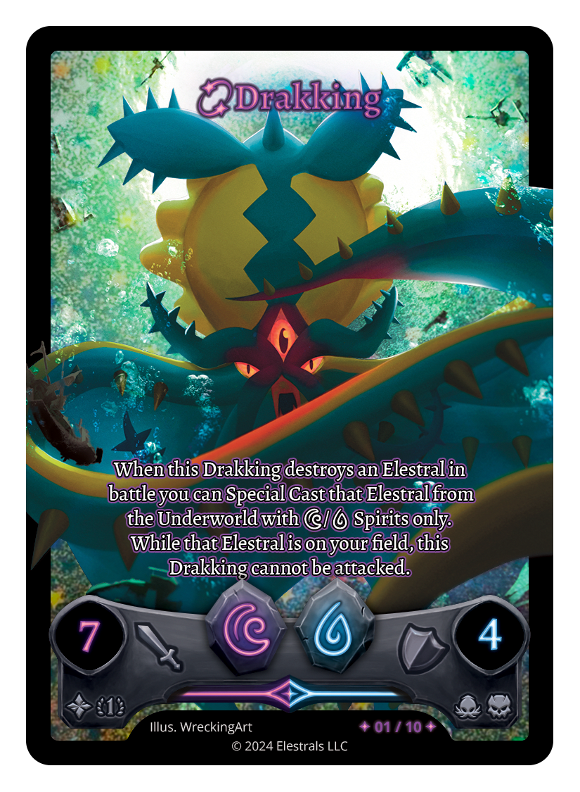When this Drakking destroys an Elestral in battle you can Special Cast that Elestral from the Underworld with {D}/{W} Spirits only. While that Elestral is on your field, this Drakking cannot be attacked.