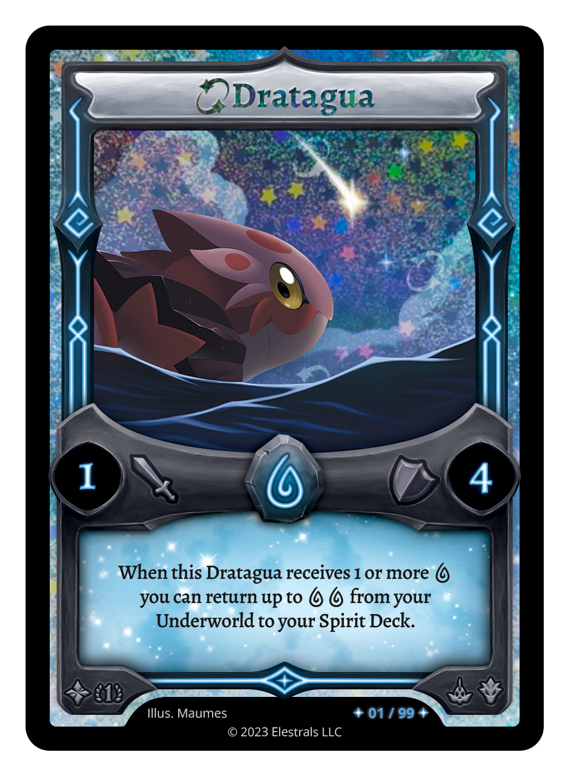 Dratagua❮❯❮❯❮❯❮❯❮❯❮❯SS1-36FF1-048XX/99SD08-09FST-SD030LST-SD026TypeElestralCostWaterElementsWaterAttack1Defense4Card TextWhen this Dratagua receives 1 or more {W} you can return up to {WW} from your Underworld to your Spirit Deck.SubclassesAquaticDragon