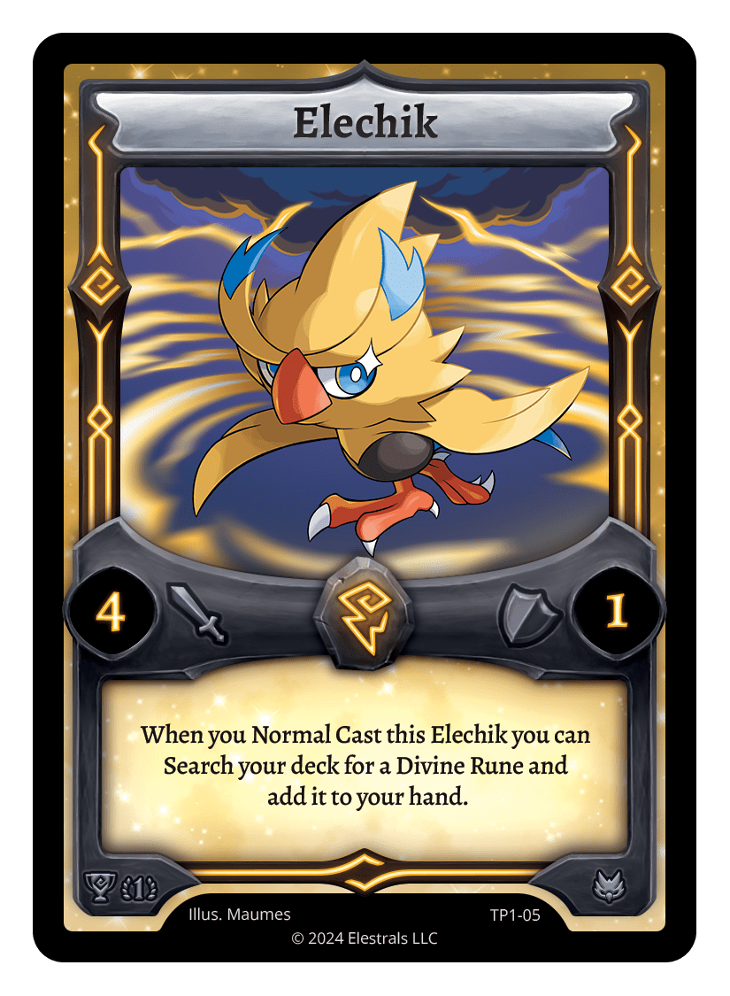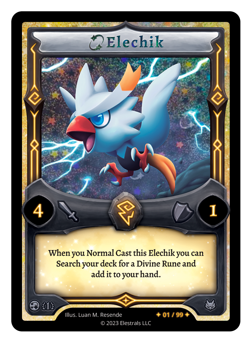 Elechik❮❯❮❯❮❯❮❯❮❯❮❯❮❯❮❯❮❯XX/99BS1-058BS1-058SD05-11SD07-10SD05-11TP1-05FST-SD040SD10-13TypeElestralCostThunderElementsThunderAttack4Defense1Card TextWhen you Normal Cast this Elechik you can Search your deck for a Divine Rune and add it to your hand.SubclassesAvian