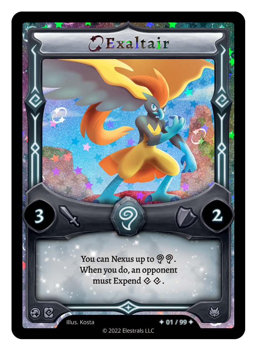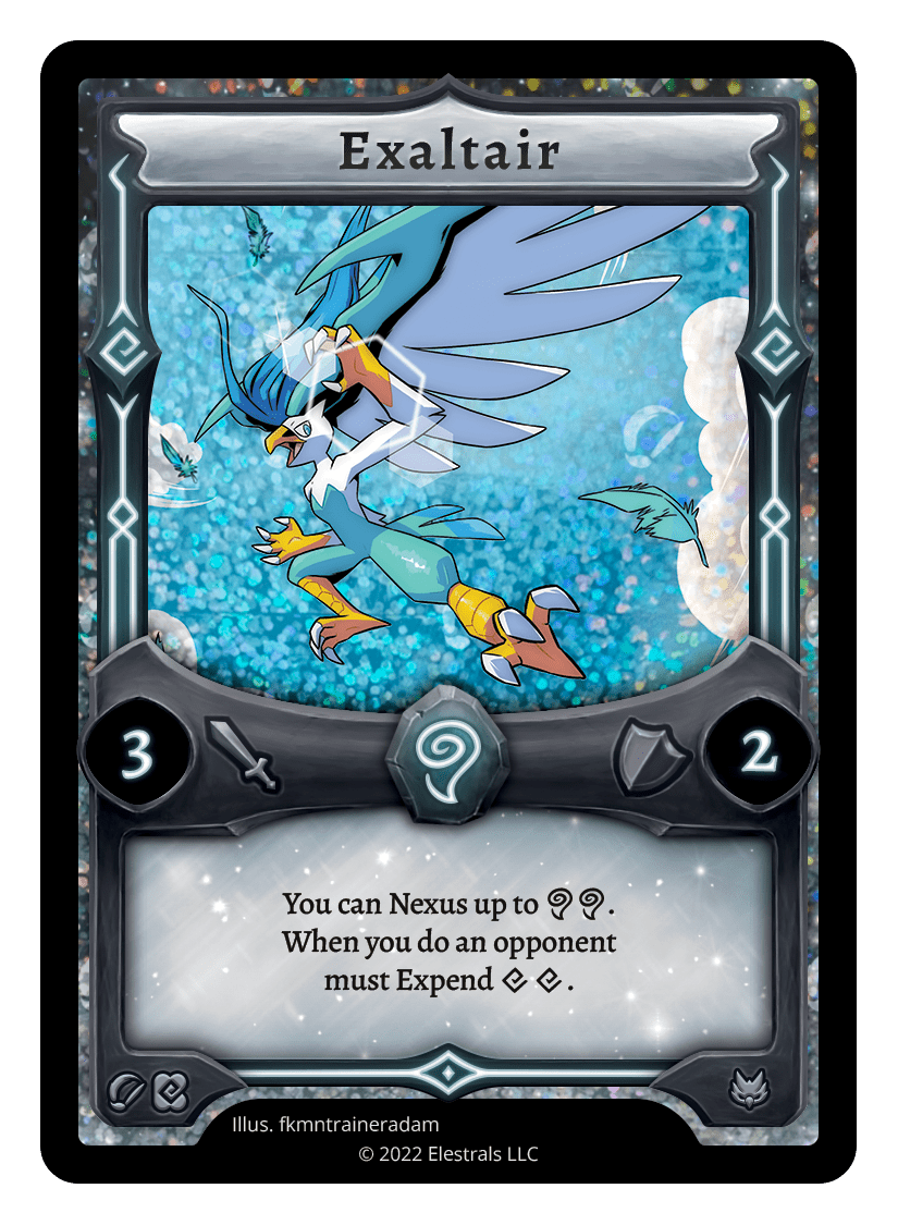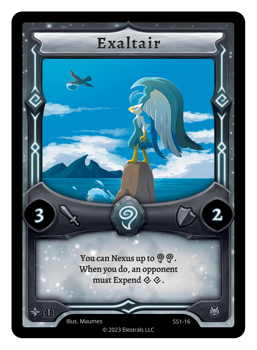 Exaltair❮❯❮❯❮❯❮❯❮❯❮❯❮❯❮❯SD05-07XX/99AC1-10BS1-080SS1-16SD05-07BS1-080SD10-11TypeElestralCostWindElementsWindAttack3Defense2Card TextYou can Nexus up to {AA}. When you do, an opponent must Expend {XX}.SubclassesAvian