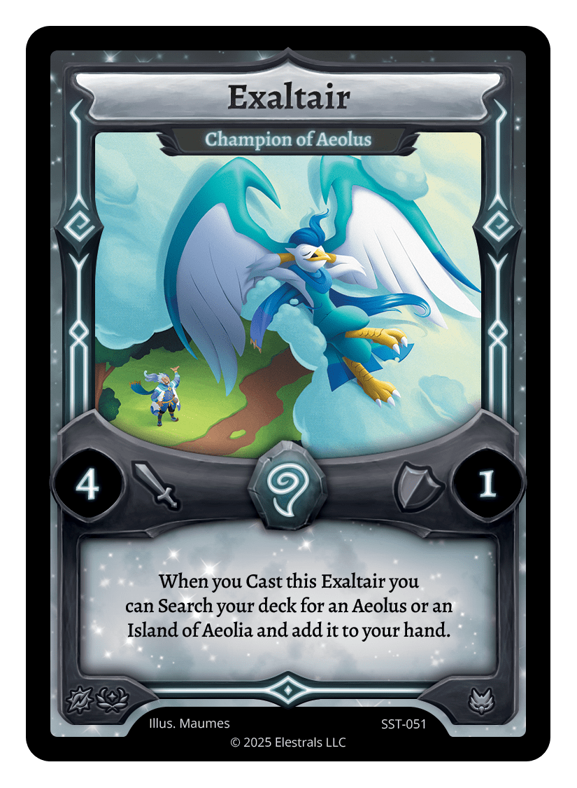 Exaltair - Champion of Aeolus❮❯❮❯SST-051SST-SD044TypeElestralCostWindElementsWindAttack4Defense1Card TextWhen you Cast this Exaltair you can Search your deck for an Aeolus or an Island of Aeolia and add it to your hand.SubclassesAvian