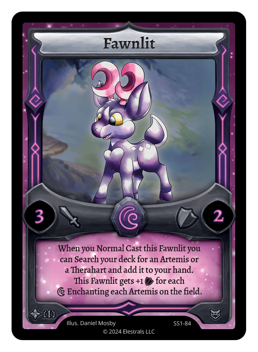 When you Normal Cast this Fawnlit you can Search your deck for an Artemis or a Therahart and add it to your hand. This Fawnlit gets +1 {O} for each {D} Enchanting each Artemis on the field.