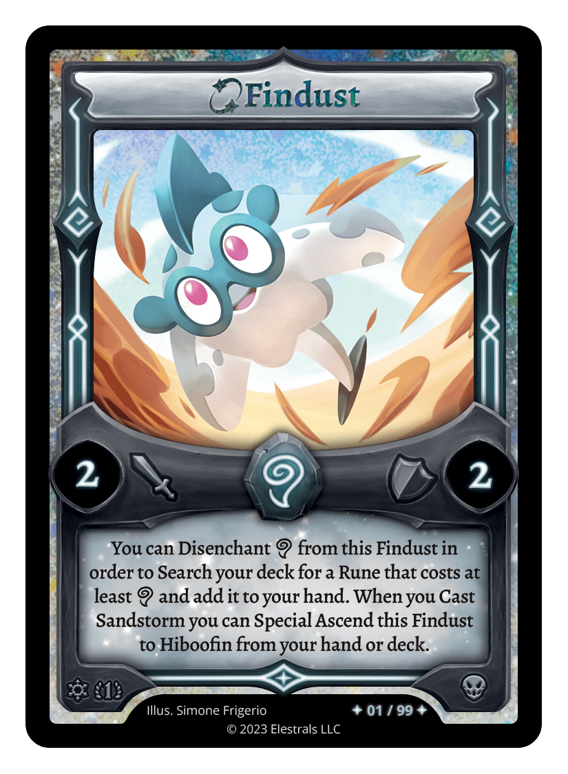 You can Disenchant {A} from this Findust in order to Search your deck for a {A} Rune and add it to your hand. When you Cast Sandstorm you can Special Ascend this Findust to Hiboofin from your hand or deck.