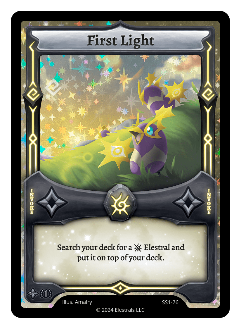First Light❮❯❮❯❮❯❮❯❮❯SD09-26DB1-069SD09-17SS1-76KSC-10TypeRuneInvokeCostSolarElementsSolarCard TextSearch your deck for a {L} Elestral and put it on top of your deck.