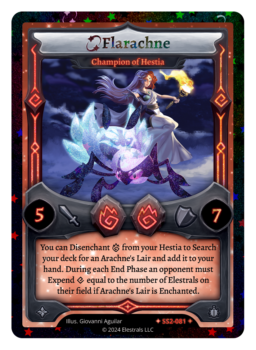 You can Disenchant {F} from your Hestia to Search your deck for an Arachne's Lair and add it to your hand. During each End Phase an opponent must Expend {X} equal to the number of Elestrals on their field if Arachne's Lair is Enchanted.