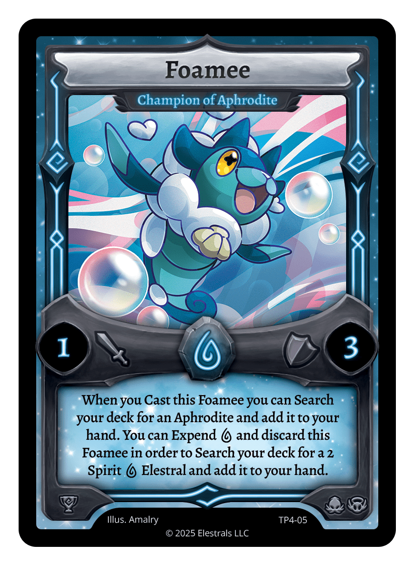 When you Cast this Foamee you can Search your deck for an Aphrodite and add it to your hand. You can Expend {W} and discard this Foamee in order to Search your deck for a 2 Spirit {W} Elestral and add it to your hand.