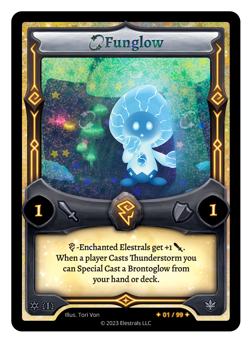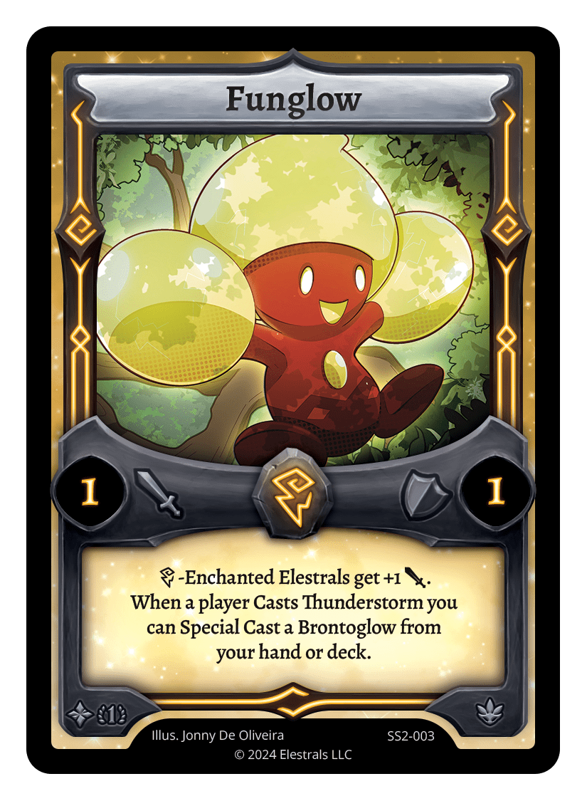Funglow❮❯❮❯❮❯XX/99FF1-055SS2-003TypeElestralCostThunderElementsThunderAttack1Defense1Card Text{T}-Enchanted Elestrals get +1 {J}. When a player Casts Thunderstorm you can Special Cast a Brontoglow from your hand or deck.SubclassesDryad