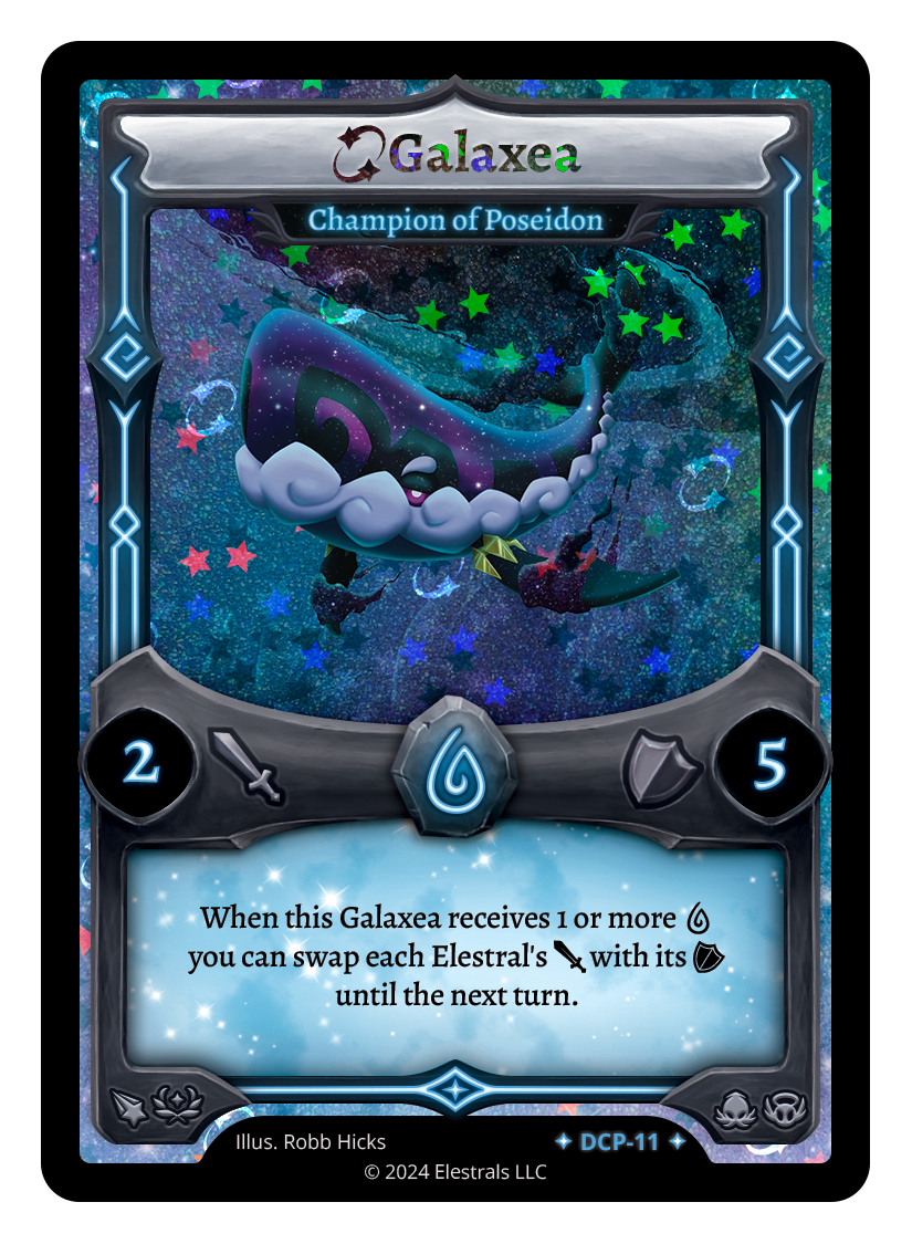 Galaxea - Champion of Poseidon❮❯❮❯❮❯FST-033DCP-11FST-SD027TypeElestralCostWaterElementsWaterAttack2Defense5Card TextWhen this Galaxea receives 1 or more {W} you can swap each Elestral's {J} with its {O} until the next turn.SubclassesOceanicEthereal