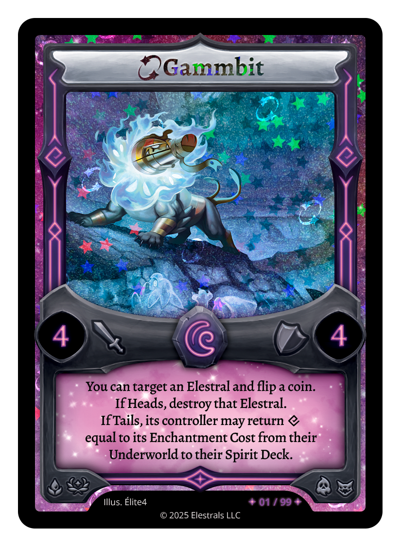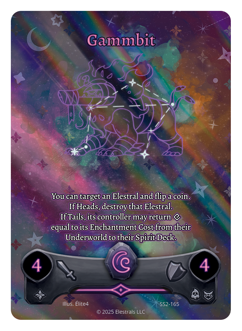 You can target an Elestral and flip a coin. If Heads, destroy that Elestral. If Tails, its controller may return {X} equal to its Enchantment Cost from their Underworld to their Spirit Deck.