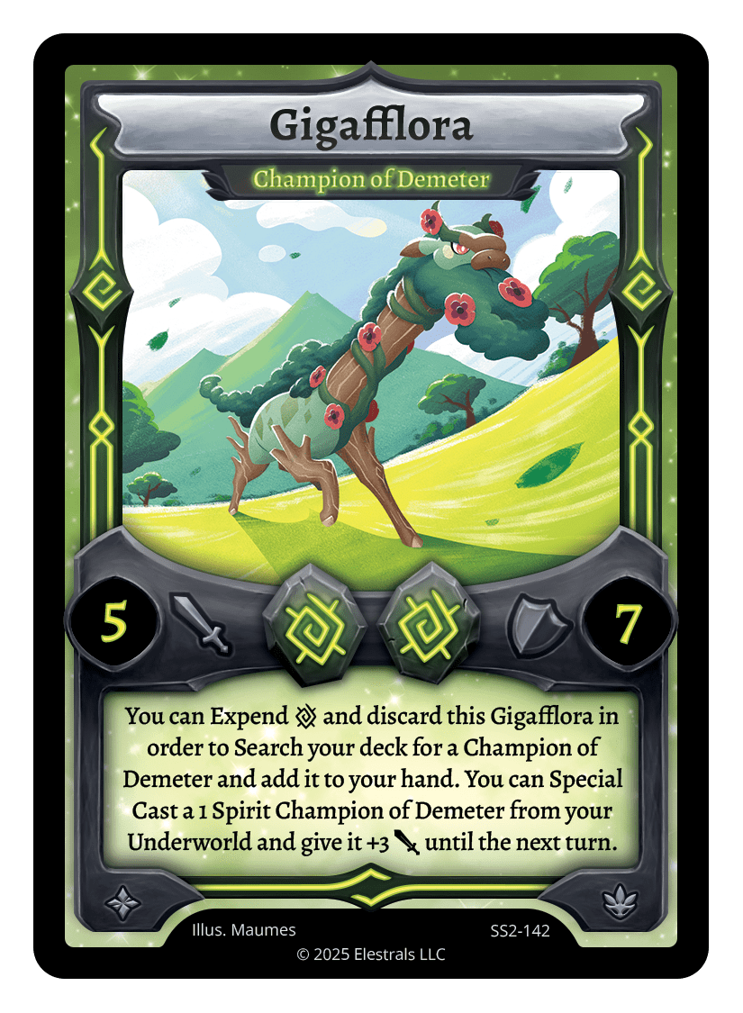 You can Expend {E} and discard this Gigafflora in order to Search your deck for a Champion of Demeter and add it to your hand. You can Special Cast a 1 Spirit Champion of Demeter from your Underworld and give it +3 {J} until the next turn.