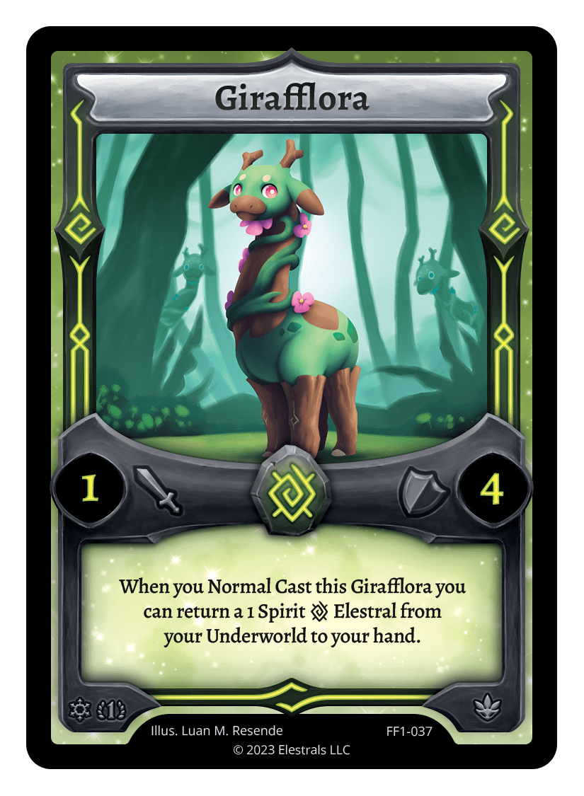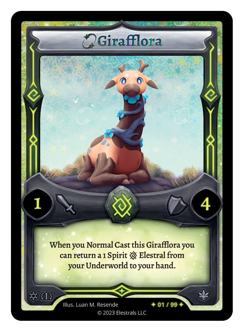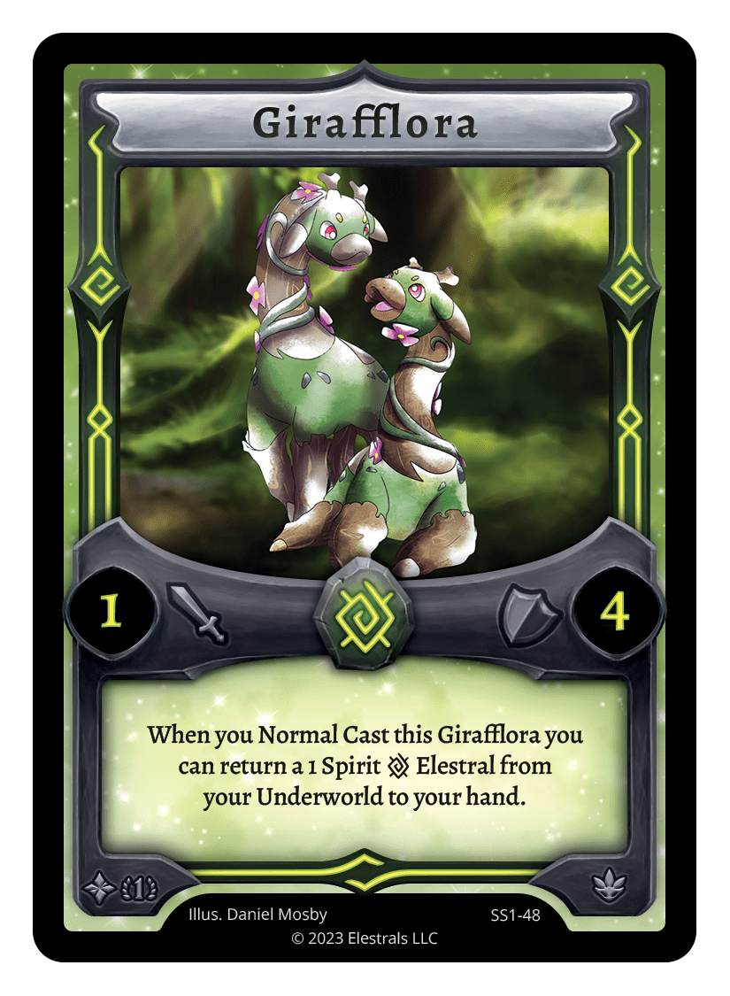 Girafflora❮❯❮❯❮❯❮❯❮❯XX/99SS1-48SD01-06SD01-06FF1-037TypeElestralCostEarthElementsEarthAttack1Defense4Card TextWhen you Normal Cast this Girafflora you can return a 1 Spirit {E} Elestral from your Underworld to your hand.SubclassesDryad
