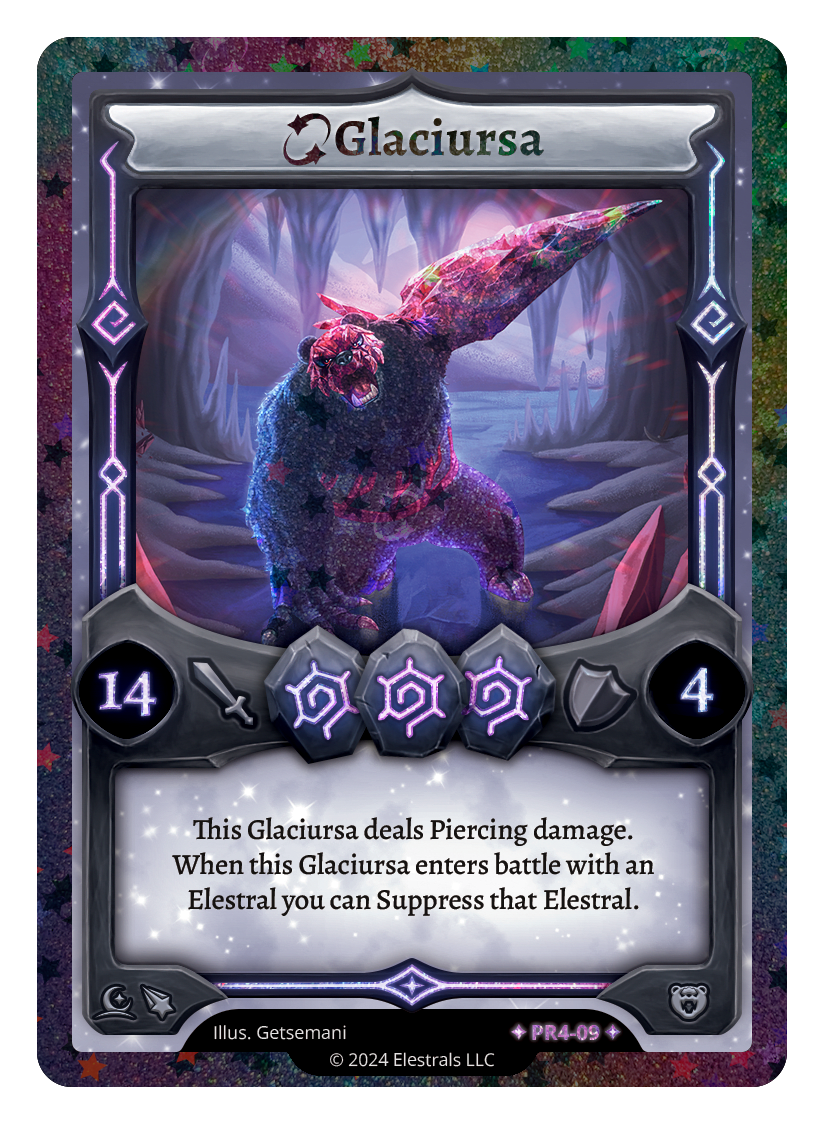 Glaciursa❮❯❮❯❮❯❮❯FF1-092FF1-018FST-SD061PR4-09TypeElestralCostFrostFrostFrostElementsFrostAttack14Defense4Card TextThis Glaciursa deals Piercing damage. When this Glaciursa enters battle with an Elestral you can Suppress that Elestral.SubclassesUrsa