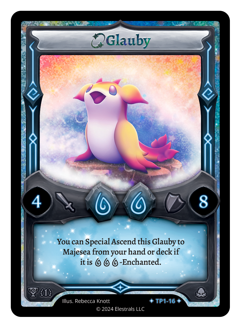 Glauby❮❯❮❯❮❯❮❯❮❯❮❯BS1-039SD03-02SD03-02BS1-039TP1-16FST-SD029TypeElestralCostWaterWaterElementsWaterAttack4Defense8Card TextYou can Special Ascend this Glauby to Majesea from your hand or deck if it is {WWW}-Enchanted.SubclassesOceanic