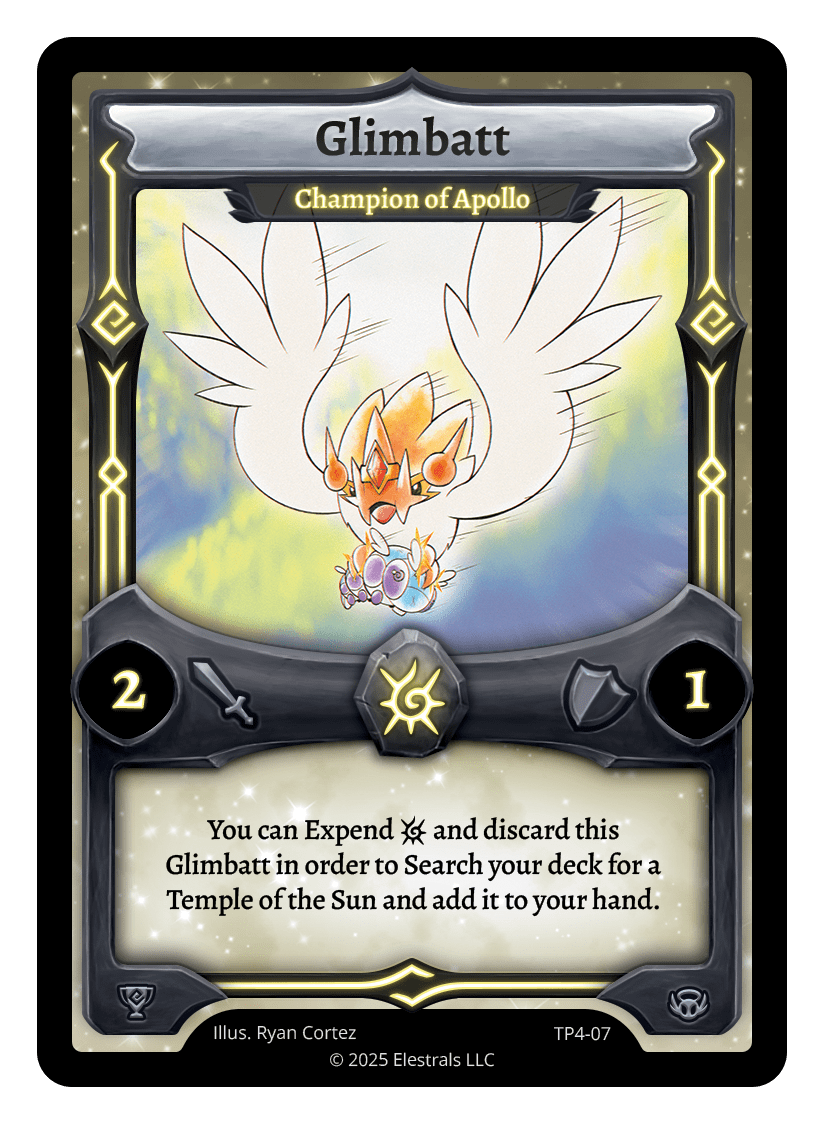 Glimbatt - Champion of Apollo❮❯❮❯❮❯LST-072TP4-07SS2-202TypeElestralCostSolarElementsSolarAttack2Defense1Card TextYou can Expend {L} and discard this Glimbatt in order to Search your deck for a Temple of the Sun and add it to your hand.SubclassesEthereal
