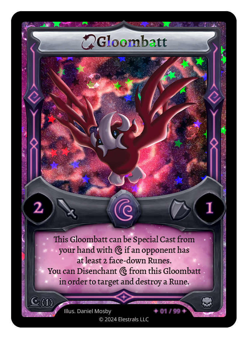 This Gloombatt can be Special Cast from your hand with {D} if an opponent has at least 2 face-down Runes. You can Disenchant {D} from this Gloombatt in order to target and destroy a Rune.