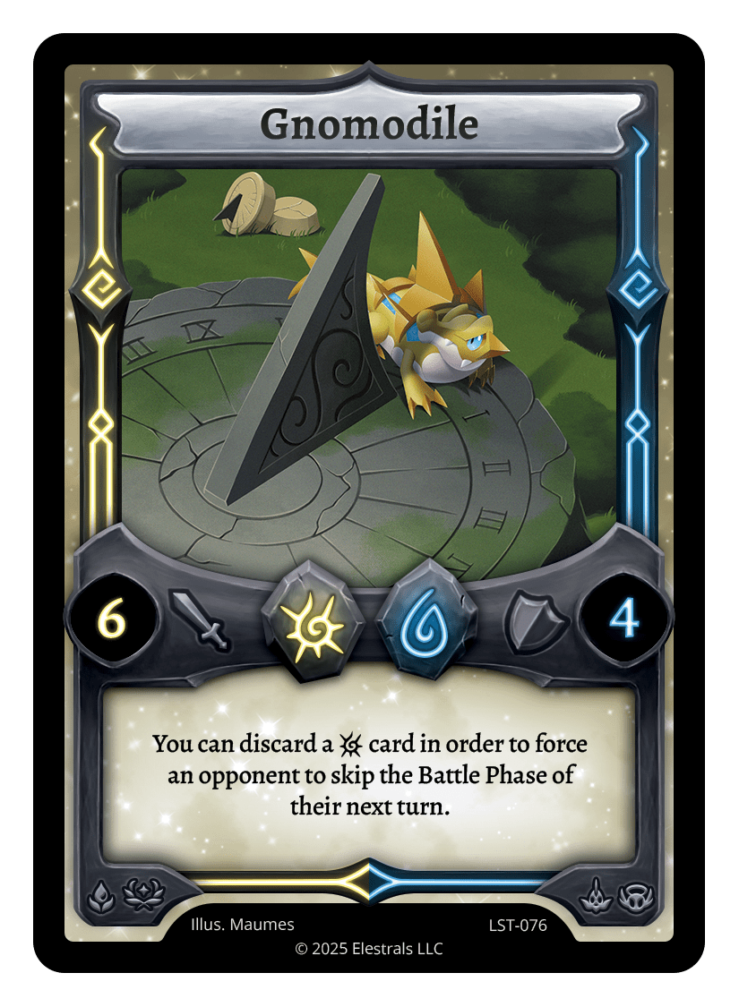 Gnomodile (LST)❮❯LST-076TypeElestralCostSolarWaterElementsSolarWaterAttack6Defense4Card TextYou can discard a {L} card in order to force an opponent to skip the Battle Phase of their next turn.SubclassesAquaticEthereal