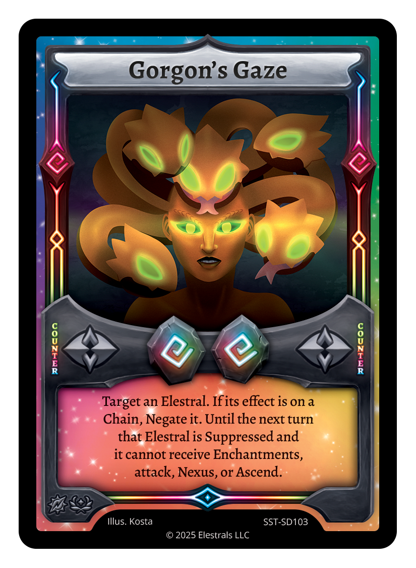 Gorgon's Gaze❮❯❮❯❮❯❮❯❮❯❮❯❮❯❮❯❮❯❮❯❮❯❮❯DB1-092SS1-66SD02-21SD06-20SD08-20SD02-21TP3-12FST-SD106SD11-21LST-SD099SS2-190SST-SD103TypeRuneCounterCostOmniOmniElementsOmniCard TextTarget an Elestral. Negate its effects on the Chain. Until the next turn that Elestral is Suppressed and it cannot receive Enchantments, attack, Nexus, or Ascend.