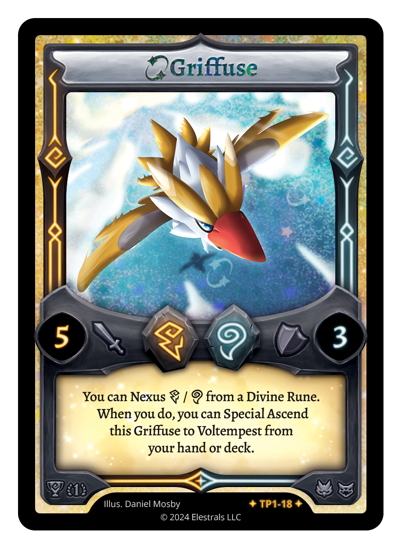 Griffuse❮❯❮❯❮❯❮❯BS1-059BS1-059TP1-18FST-SD041TypeElestralCostThunderWindElementsThunderWindAttack5Defense3Card TextYou can Nexus {T}/{A} from a Divine Rune. When you do, you can Special Ascend this Griffuse to Voltempest from your hand or deck.SubclassesAvianBrute