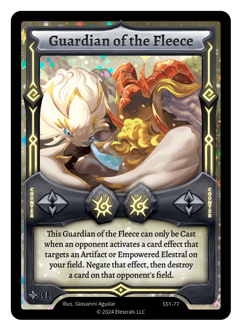 This Guardian of the Fleece can only be played when an opponent activates a card effect that targets an Artifact Rune or Empowered Elestral on your field. Negate that effect, then destroy a card on that opponent's field.