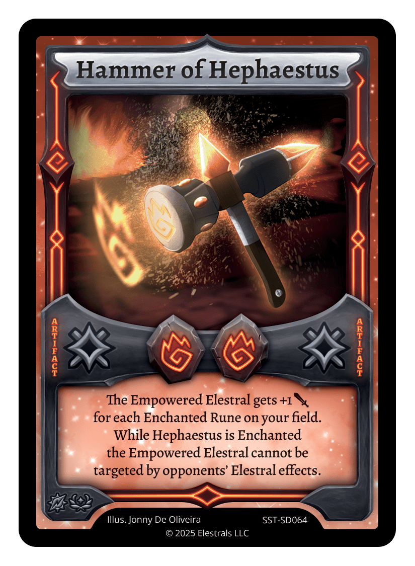 The Empowered Elestral gets +1 {J} for each Enchanted Rune on your field. While Hephaestus is Enchanted the Empowered Elestral cannot be targeted by opponents’ Elestral effects.